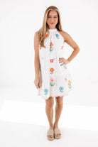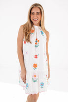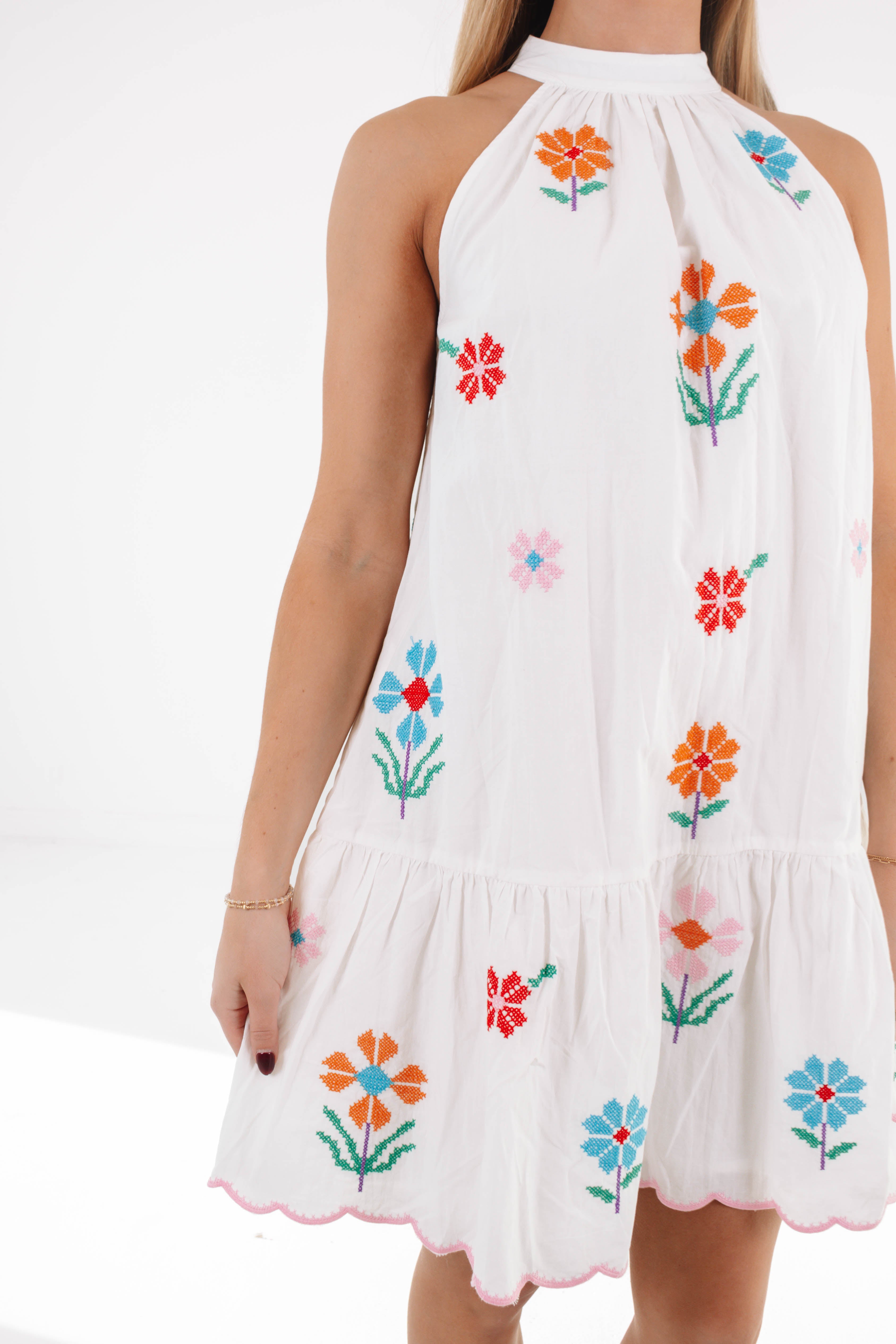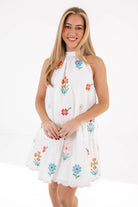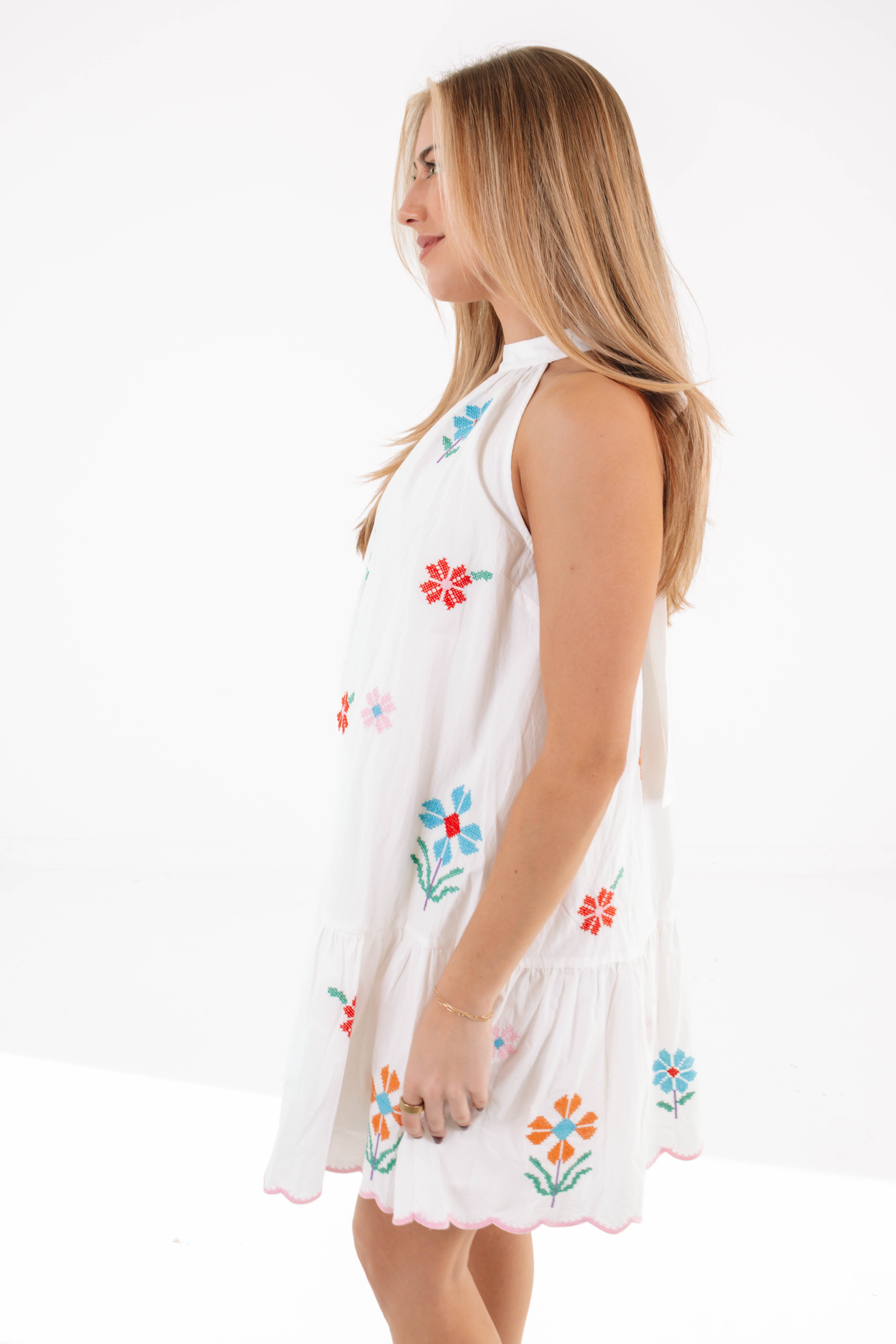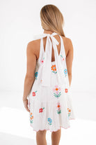 Fresh and breezy, this white A-line dress is a spring dream with its high neckline, open tie-back, and delicate embroidery. The flowy silhouette and playful details make it perfect for sunny days and warm breezes!