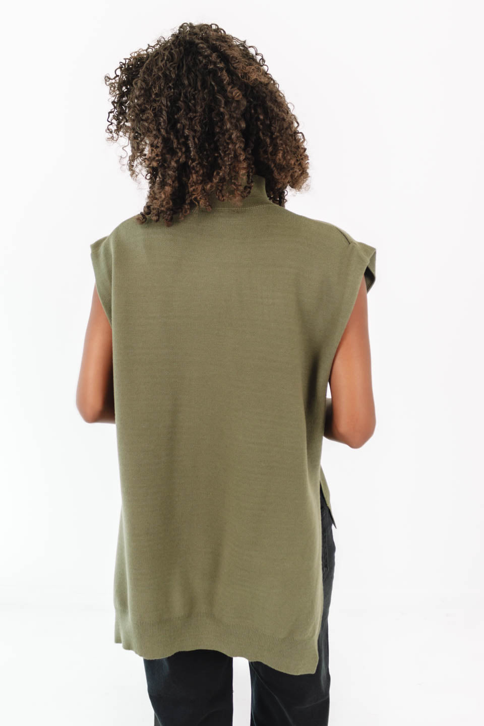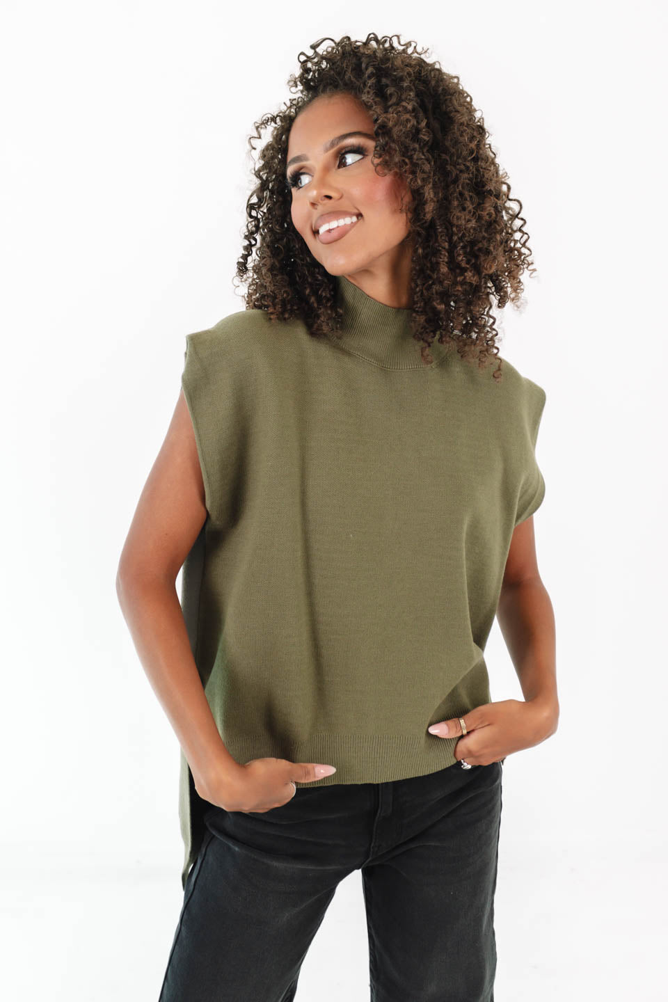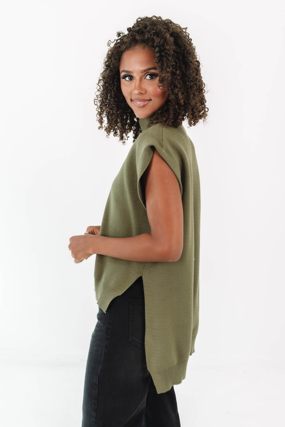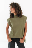 This olive green knit top is the perfect blend of chic and laid-back with its mock neck and relaxed fit. The cap sleeves and high-low hem give it a modern twist that’s easy to style. Pair it with denim or trousers, and you’ve got an effortlessly cool look for any day of the week.
