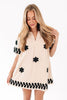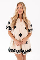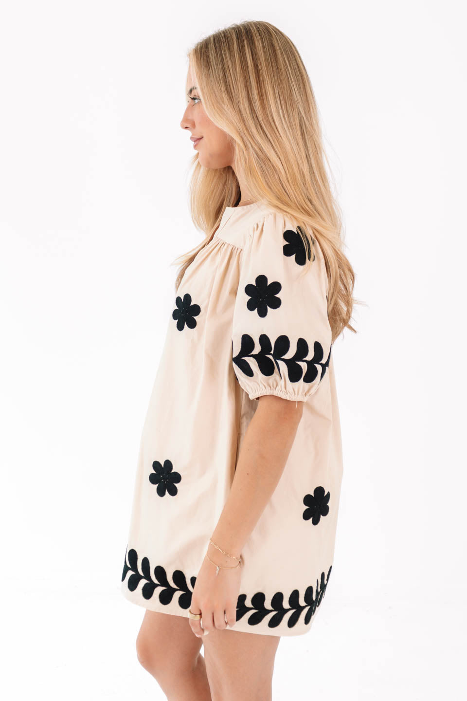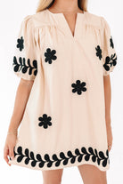 This playful mini dress is a fall-ready statement with its bold black floral accents and leafy trim. The puff sleeves and swingy silhouette make it as comfortable as it is chic. Throw on sandals or sneakers, and you’ve got the perfect outfit for brunch dates, festivals, or just dancing through the day!