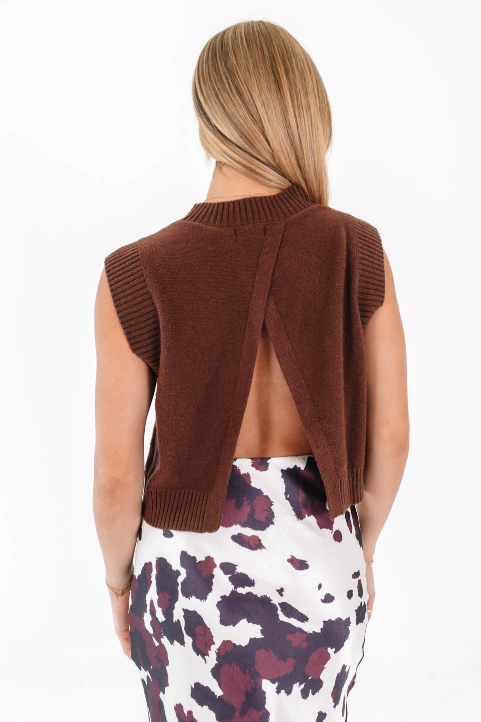This chocolate brown knit tank is your new layering BFF! With its cozy texture and boxy crop fit, it's perfect for tossing on over skirts or jeans for that effortless fall vibe. The sleeveless cut keeps it cool while still giving all the cozy feels.