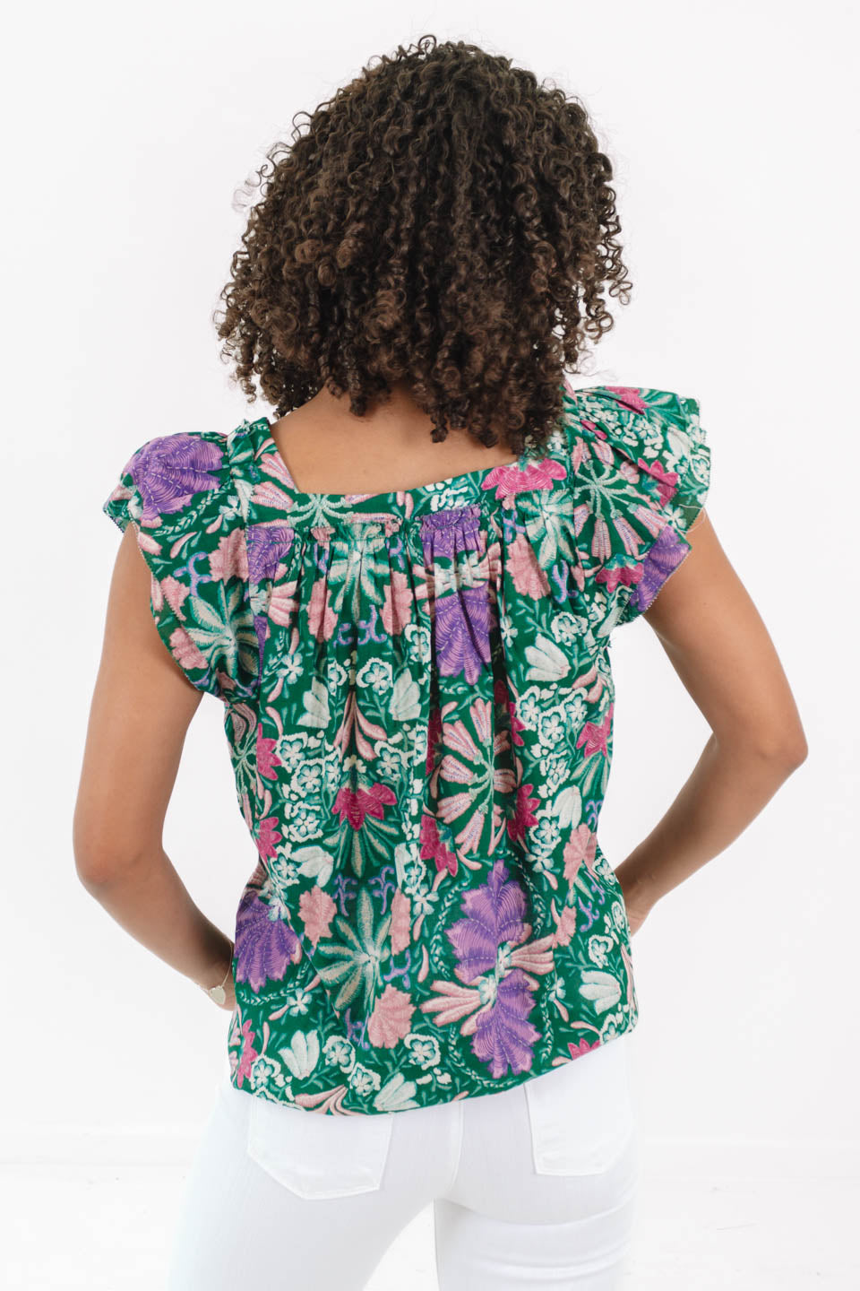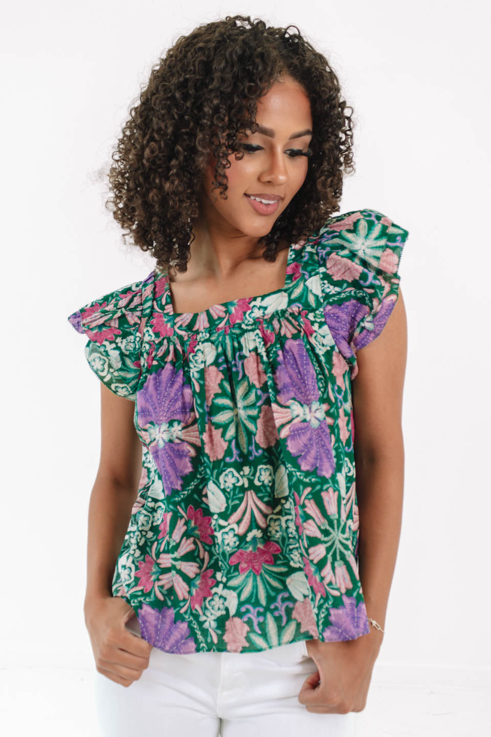 Turn heads in this vibrant floral top bursting with bold greens, purples, and pinks—like a tropical garden in full bloom! The playful ruffled sleeves and breezy fit make it perfect for sunny adventures or brunch with your besties. Pair it with your favorite white jeans and let the compliments roll in!