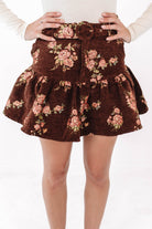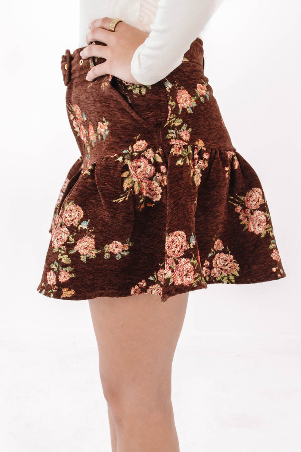 This flouncy floral skirt is giving major vintage romance vibes with a touch of sass. The rich brown fabric and rose print combo is fall perfection, complete with a belted waist that cinches you in just right. Pair it with boots or sneakers—either way, you're the main character.