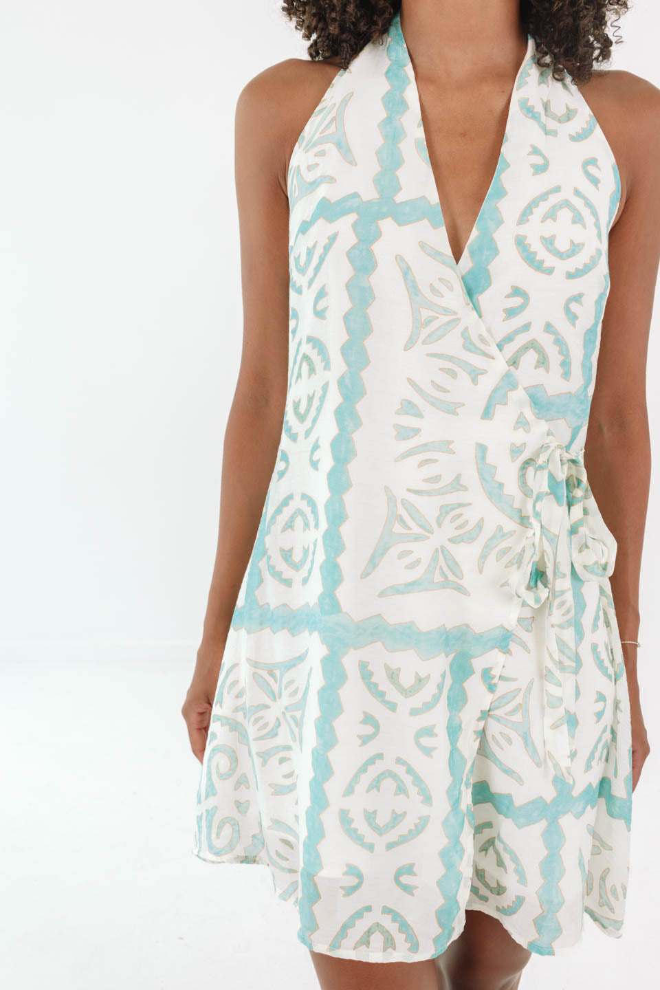 This dreamy halter mini dress is giving major vacation goddess vibes with its soft aqua and sand-toned print. The wrap silhouette and deep V neckline make it effortlessly flirty and beachside cocktail ready. Just add sun-kissed skin and a breezy attitude—paradise found.