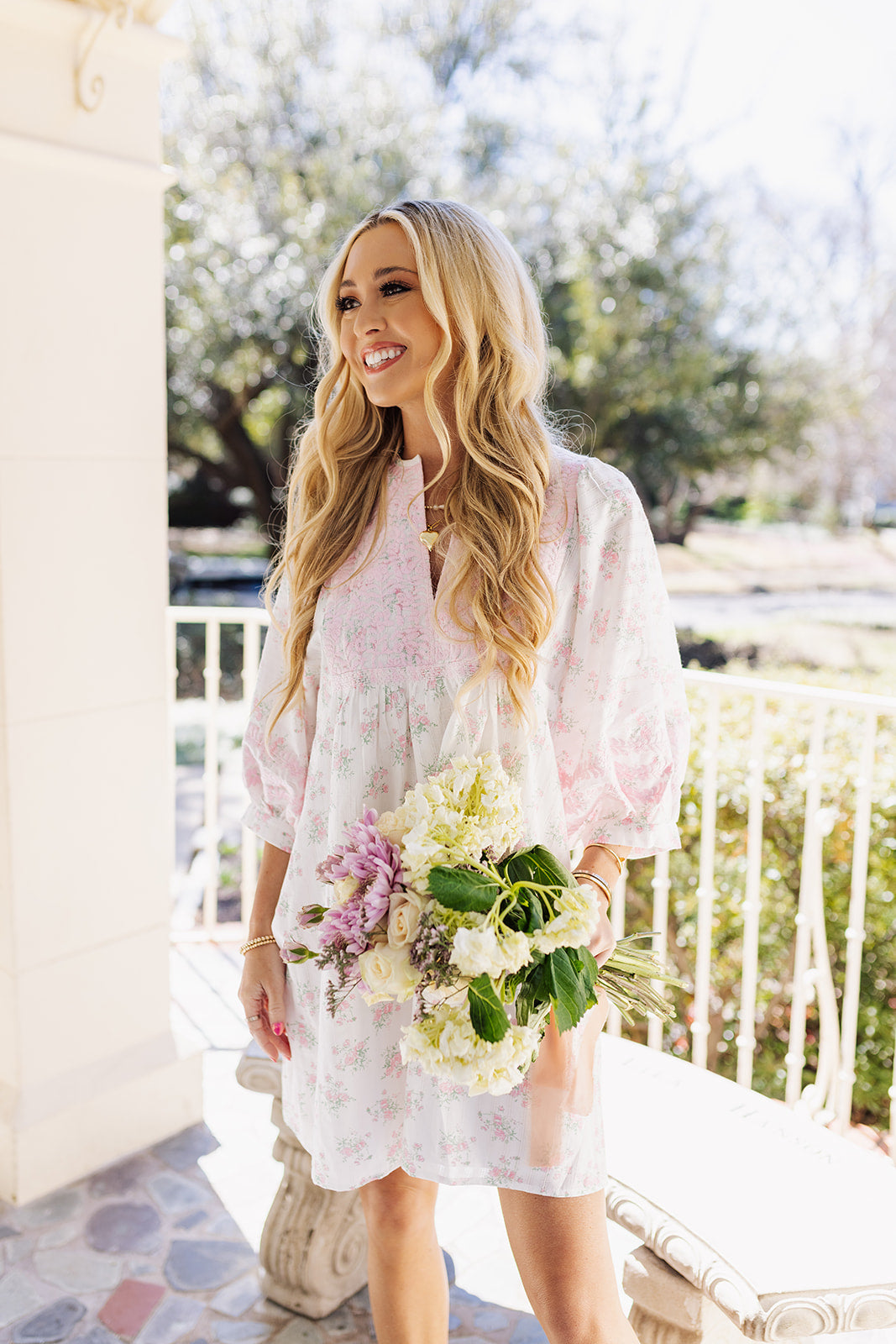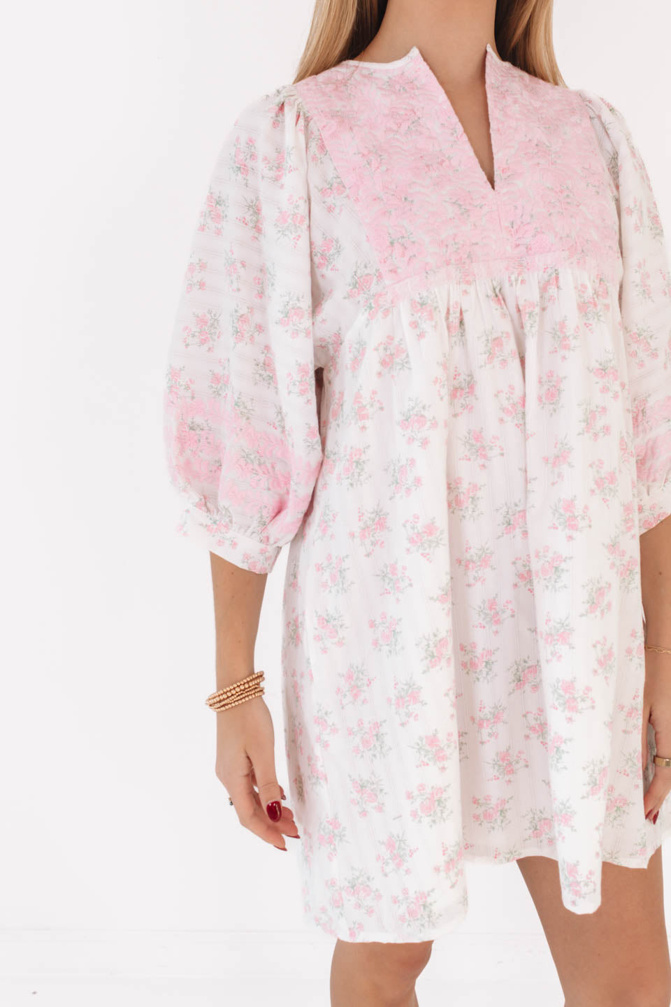 This elegant white dress features a delicate pink floral print and beautiful pink embroidery for a feminine, refined look. The v-neckline and three-quarter sleeves add a touch of sophistication, while the flowy design ensures comfort and ease. Perfect for a casual day out or date night, this dress combines grace and style effortlessly!