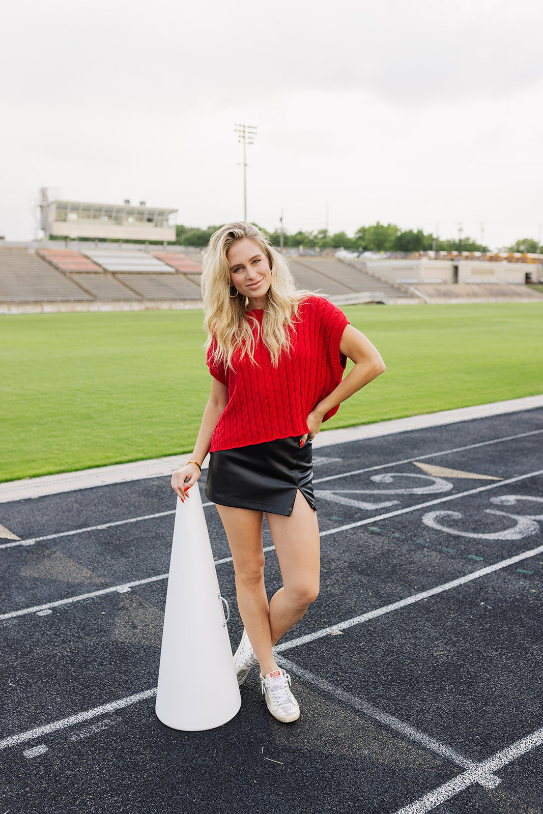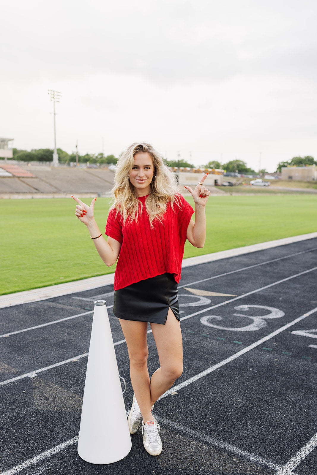 Bring the heat this game day in this bold red cable knit top – perfect for cheering loud and looking cute in the stands! Its relaxed fit keeps things comfy from tailgate to touchdown, while the pop of color shows off your school spirit. Pair it with your favorite shorts or mini for a winning campus look!
