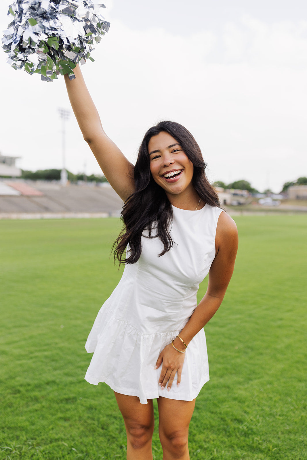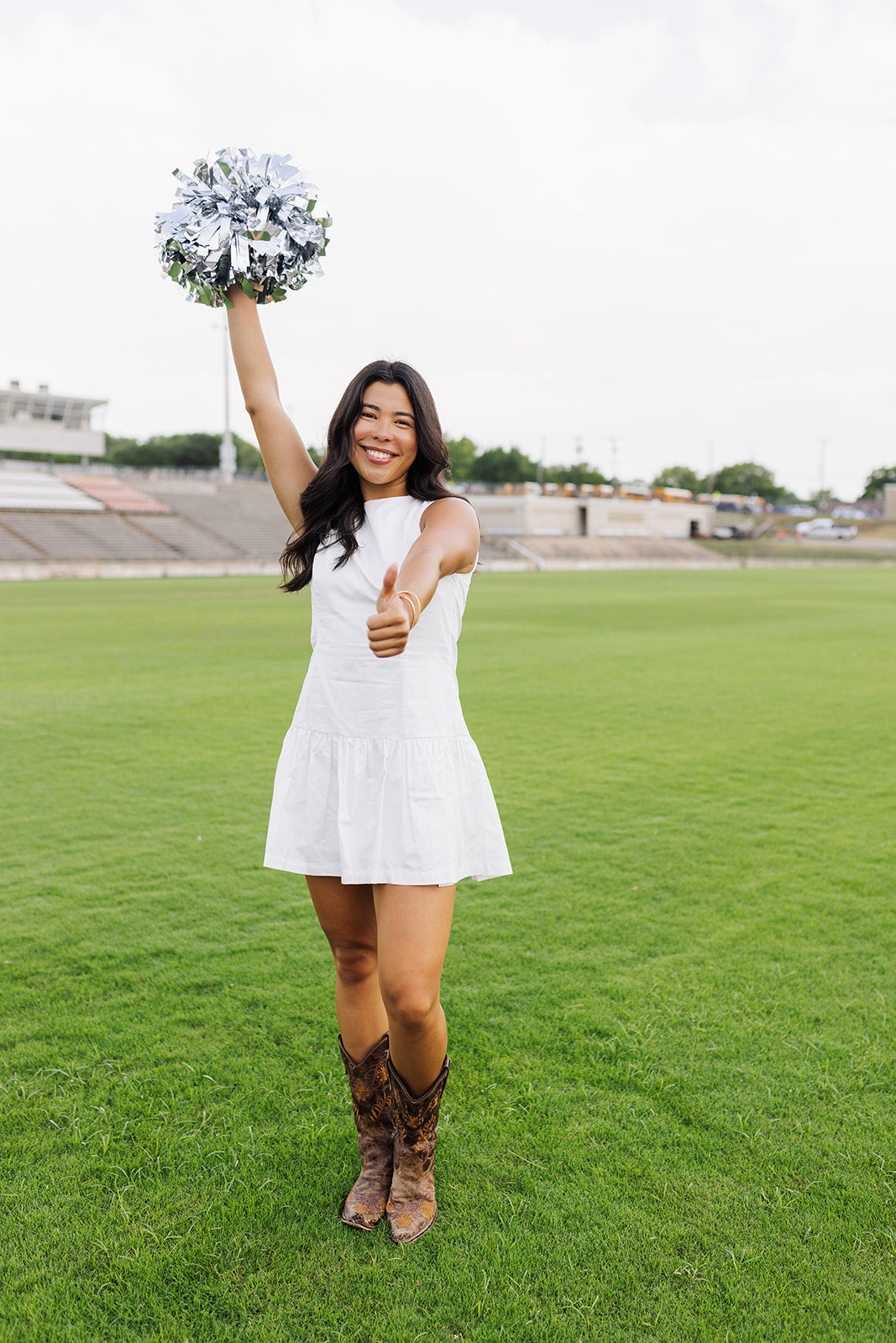 This adorable white mini dress is bringing the heat to game day! With its flattering drop waist and playful skirt, it's perfect for cheering on your team or dancing in the end zone. Just add white boots and get ready to turn the tailgate into a runway!