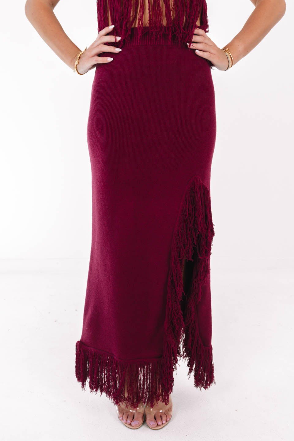 This striking set brings all the drama with its high-neck, fringe-trimmed top and matching skirt with a sassy side slit. The fringed detailing adds movement and flair, making it perfect for turning heads at any event. Whether you're out for a night on the town or attending a stylish soirée, this ensemble is sure to make a statement!