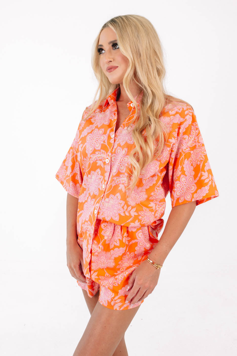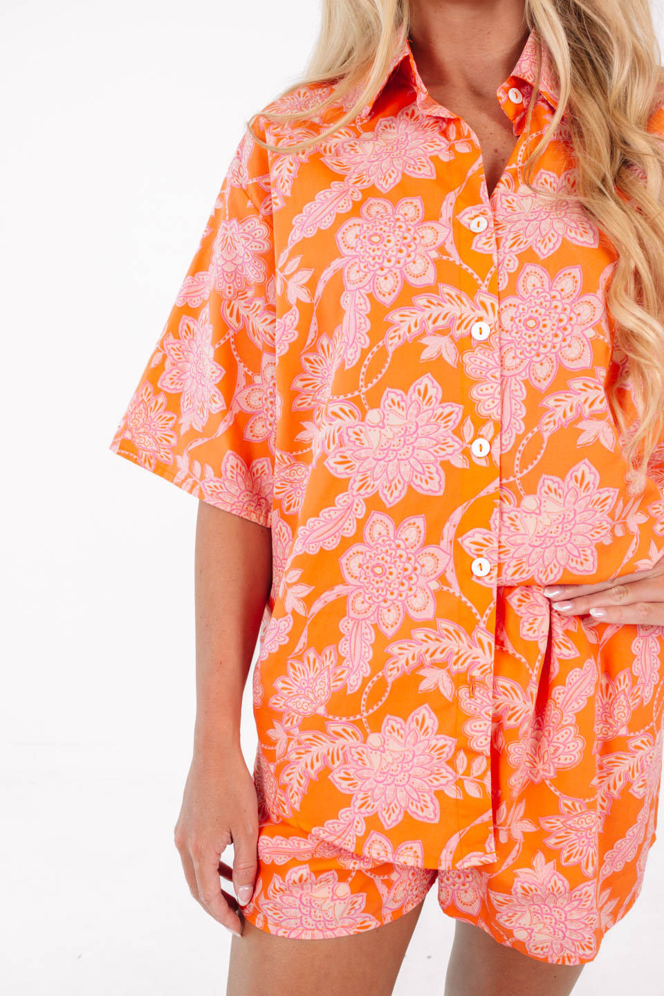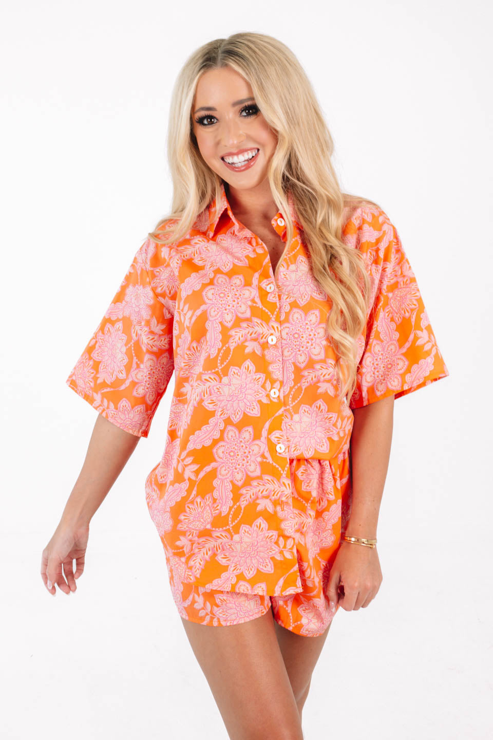 Walk into summer with the perfect summer top. Pair with the See Ya At Sunset Shorts for a matching set that is perfect for a beach day or a lake weekend! This set looks perfect over a swimsuit or on its own, and its bright orange and pink pattern makes this top stand out with any summer colors!