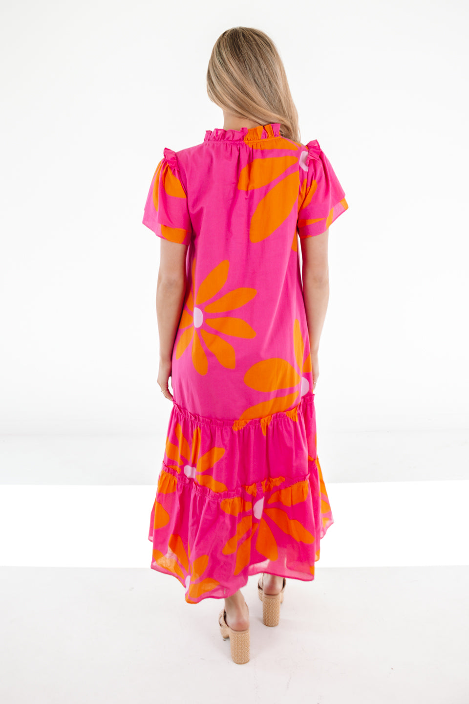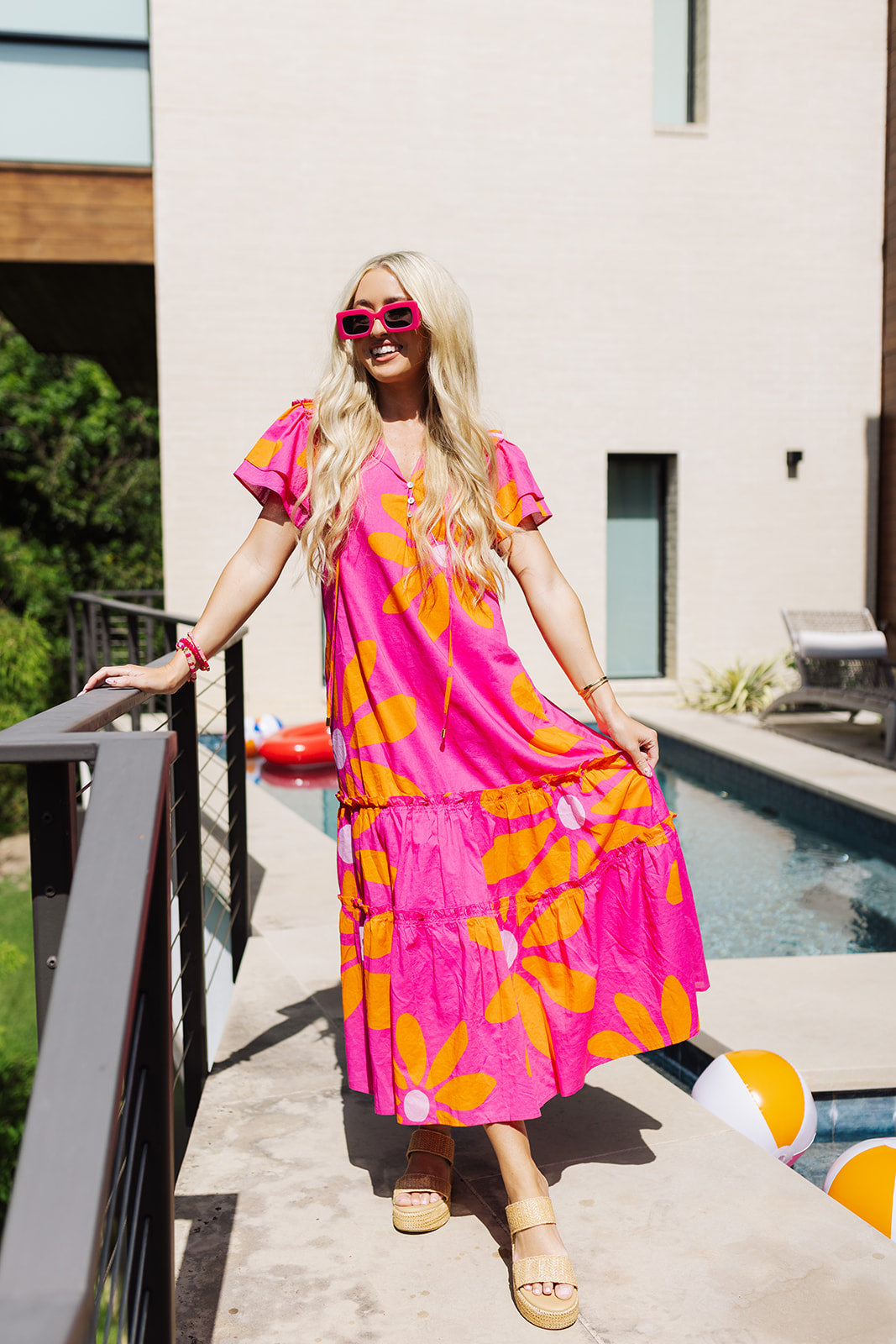 Embrace the spirit of summer with this stunning pink maxi dress, adorned with vibrant orange flowers for a cheerful pop of color. The V-neck with ties and a few front buttons add a touch of boho charm, while the pockets ensure practicality meets style. Flowing and fabulous, this dress is your perfect companion for sun-soaked adventures and breezy evenings!