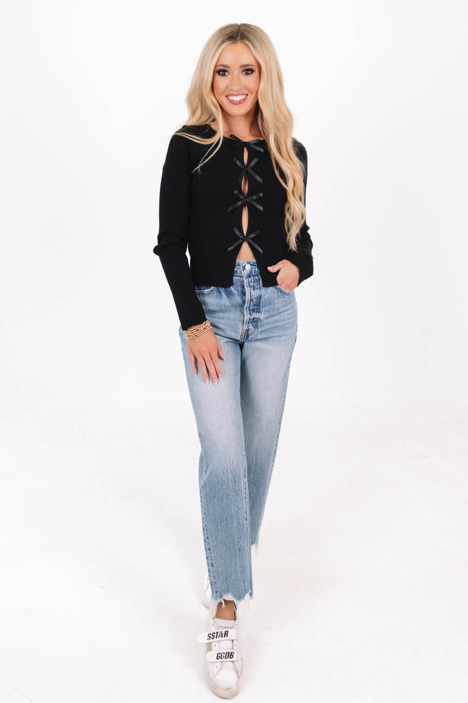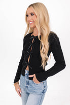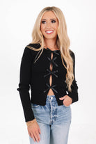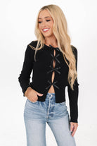 This chic black top combines edgy details with a playful twist! Featuring a row of satin bows along the front, it brings a flirty flair to any casual outfit. Pair it with jeans for a laid-back look that’s anything but ordinary!