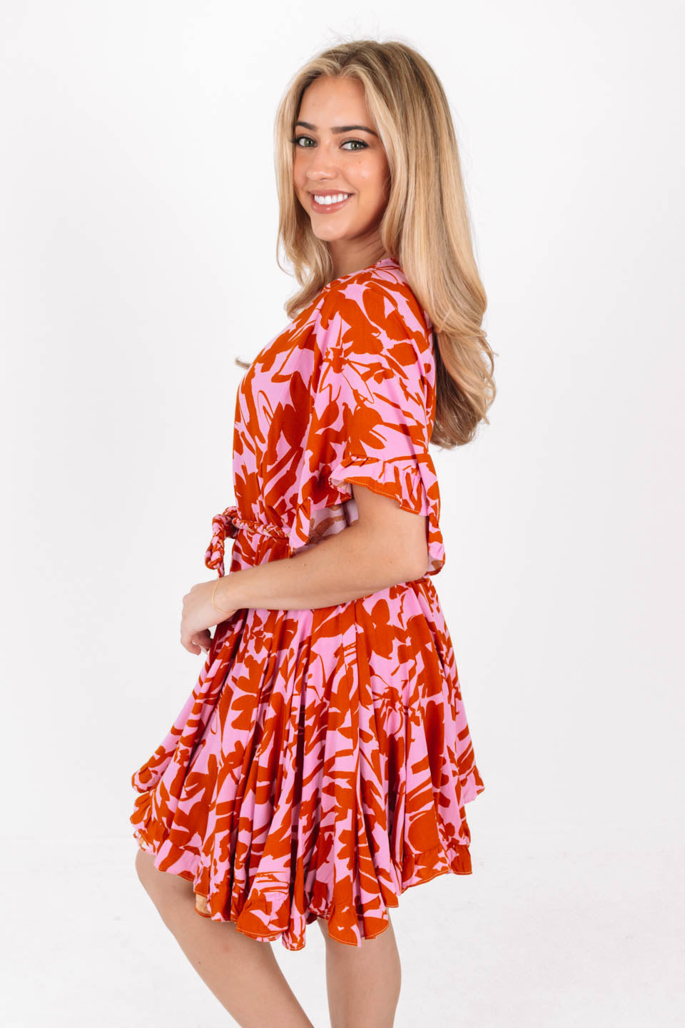 Turn heads in this pink and orange closet staple! This pink and orange floral print looks great with boots and sandals, to create the perfect look for any season! This dress has a loose fit for a light and airy feel, along with a rope tie belt to create a beautiful silhouette!