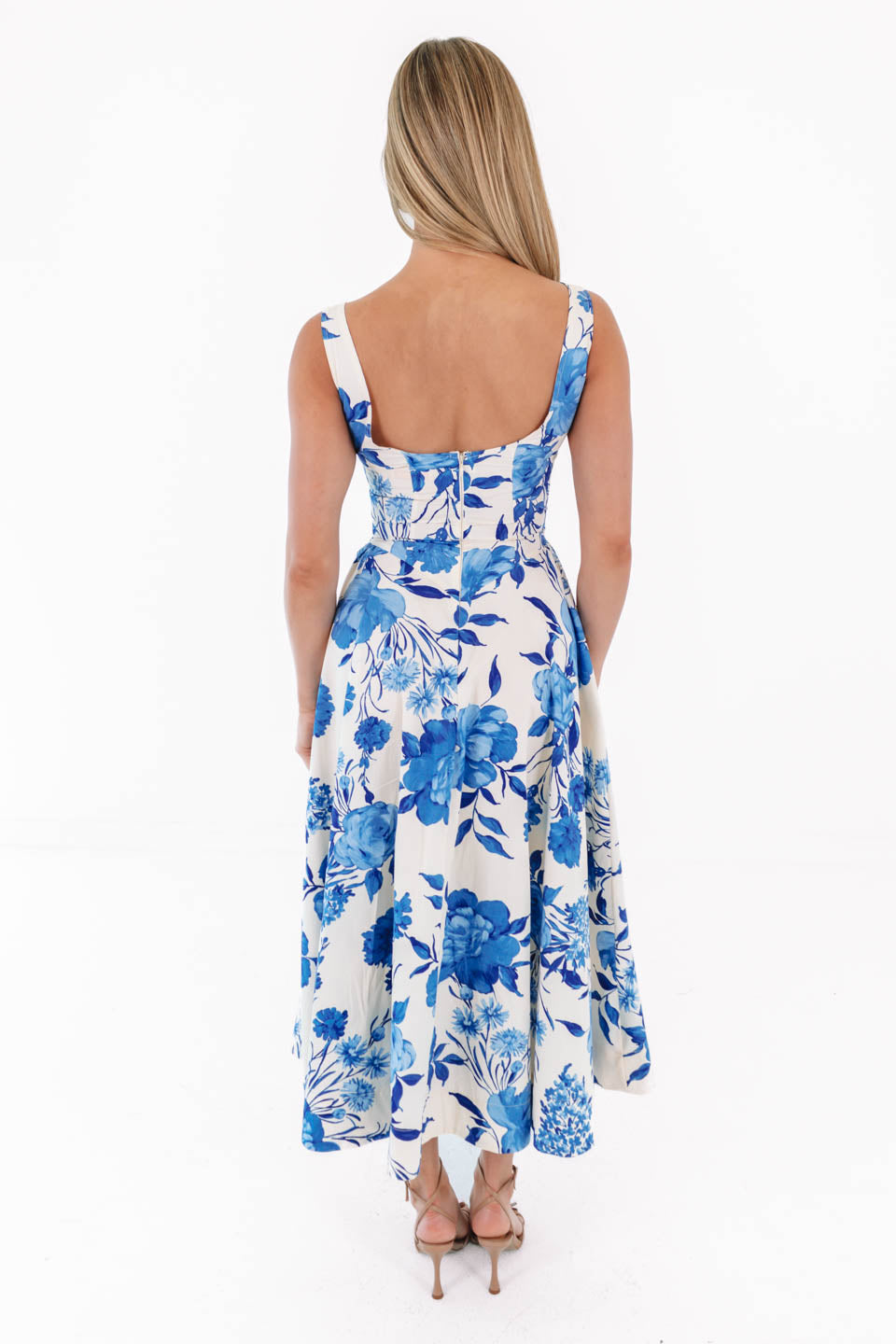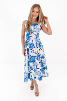 Fresh, feminine, and effortlessly graceful, this blue floral midi dress is a breath of fresh air. The classic sleeveless silhouette pairs perfectly with the flowy skirt, creating a look that moves beautifully with every step. Whether you’re headed to brunch, a garden party, or a summer wedding, this dress is ready to bloom wherever you go.