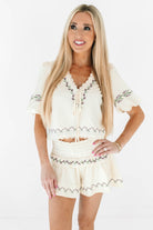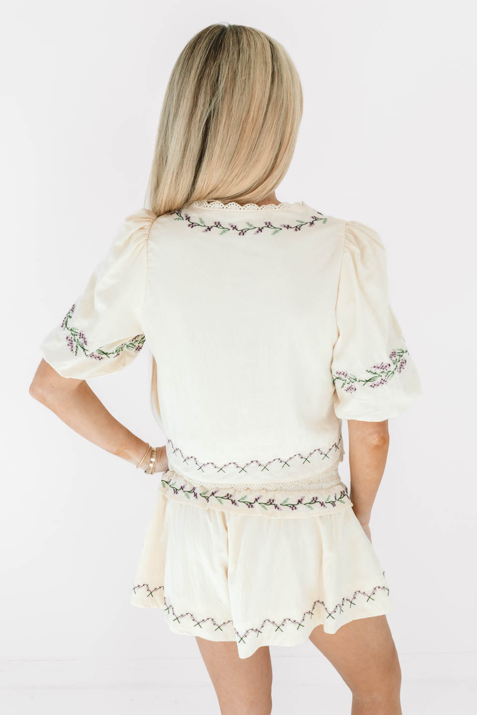 This dreamy cropped blouse brings all the romantic vibes with its soft puff sleeves and dainty embroidered details. The scalloped neckline and adjustable tie add a playful, feminine finish that feels effortlessly pretty. Pair it with the matching shorts or your favorite denim for an instant outfit crush.