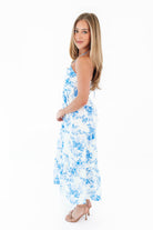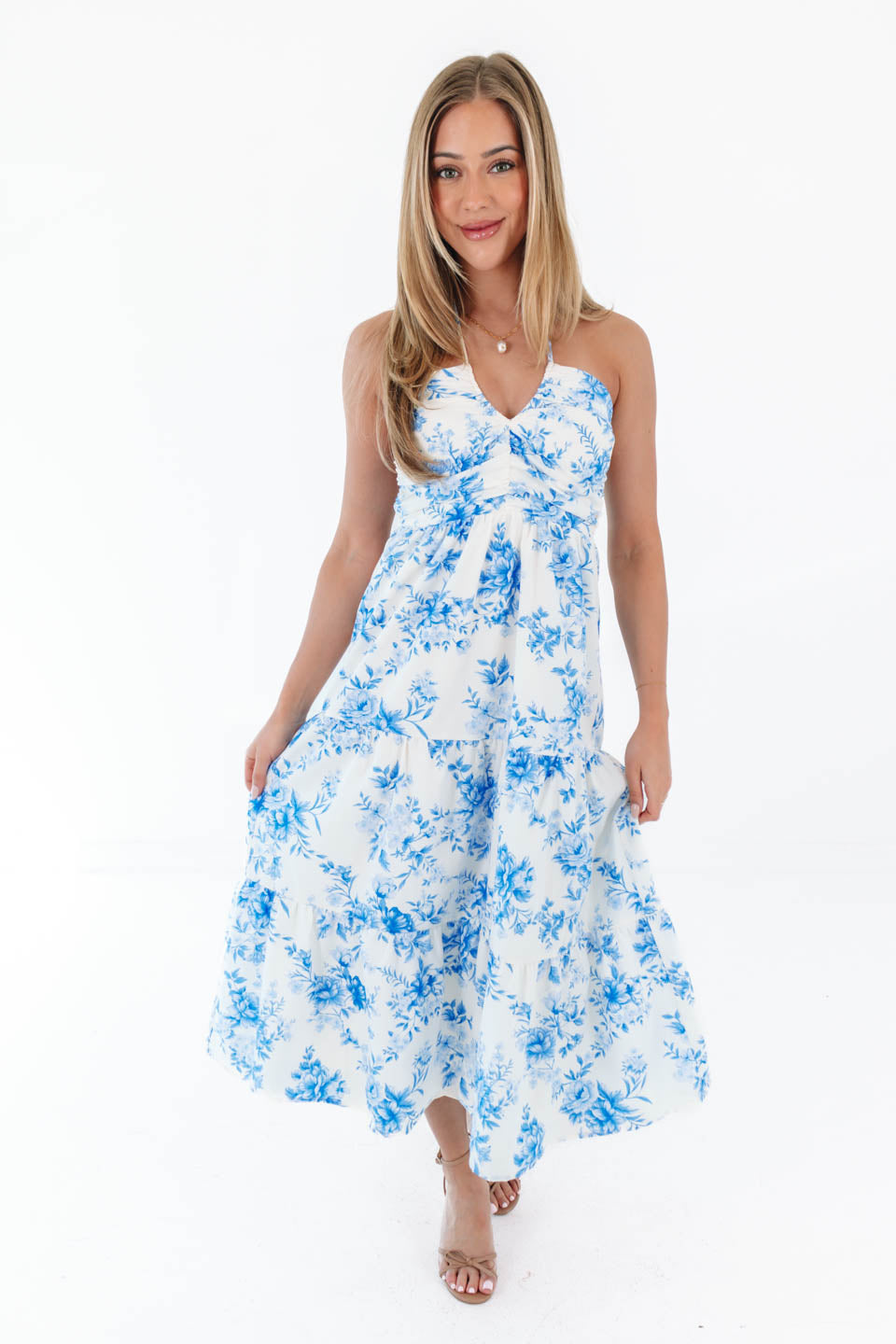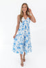Fresh, flirty, and made for sunny days, this blue and white floral midi dress is pure warm-weather romance. The halter neckline and fitted bodice flow into a breezy tiered skirt that moves beautifully with every step. Whether you're headed to brunch, a garden party, or a seaside getaway, this dreamy number is ready to twirl the day away.