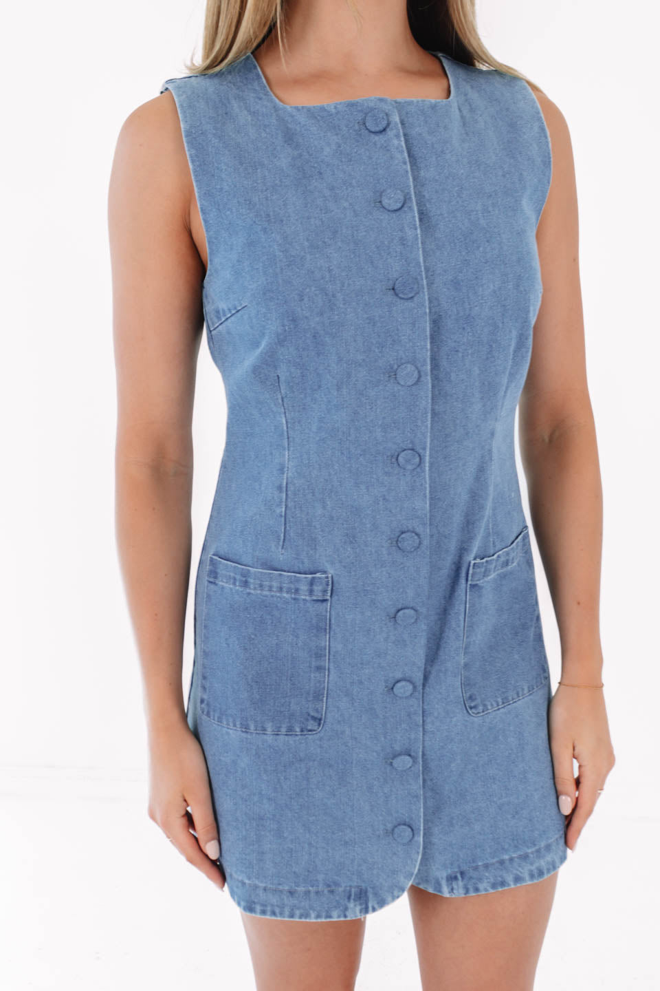 This denim dress is a timeless classic with a playful, modern twist. The button-front detail and roomy pockets make it equal parts cute and practical. Easy to dress up or down, it’s your go-to piece for sunny days and casual plans.