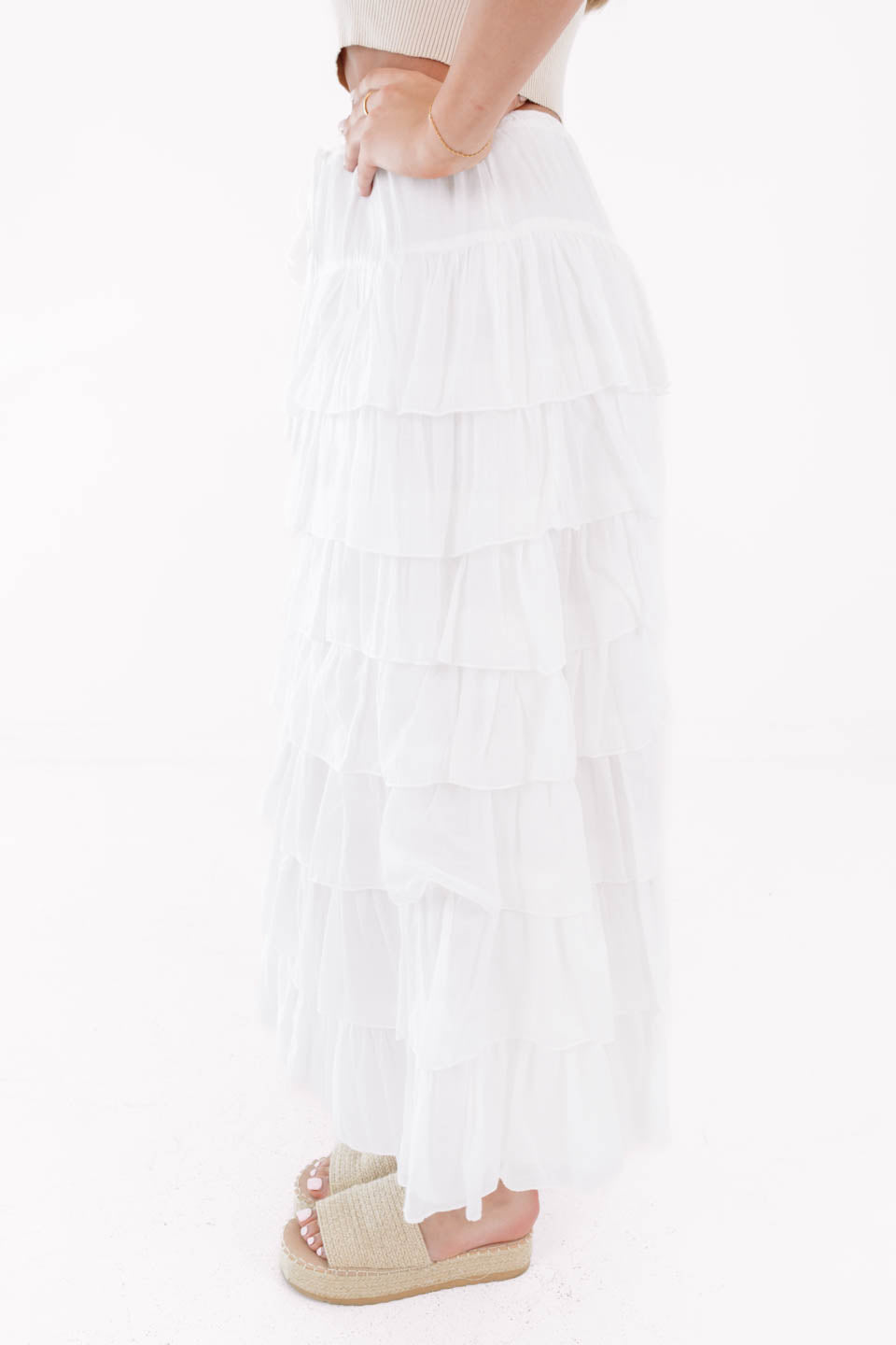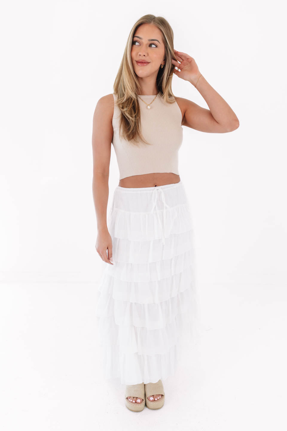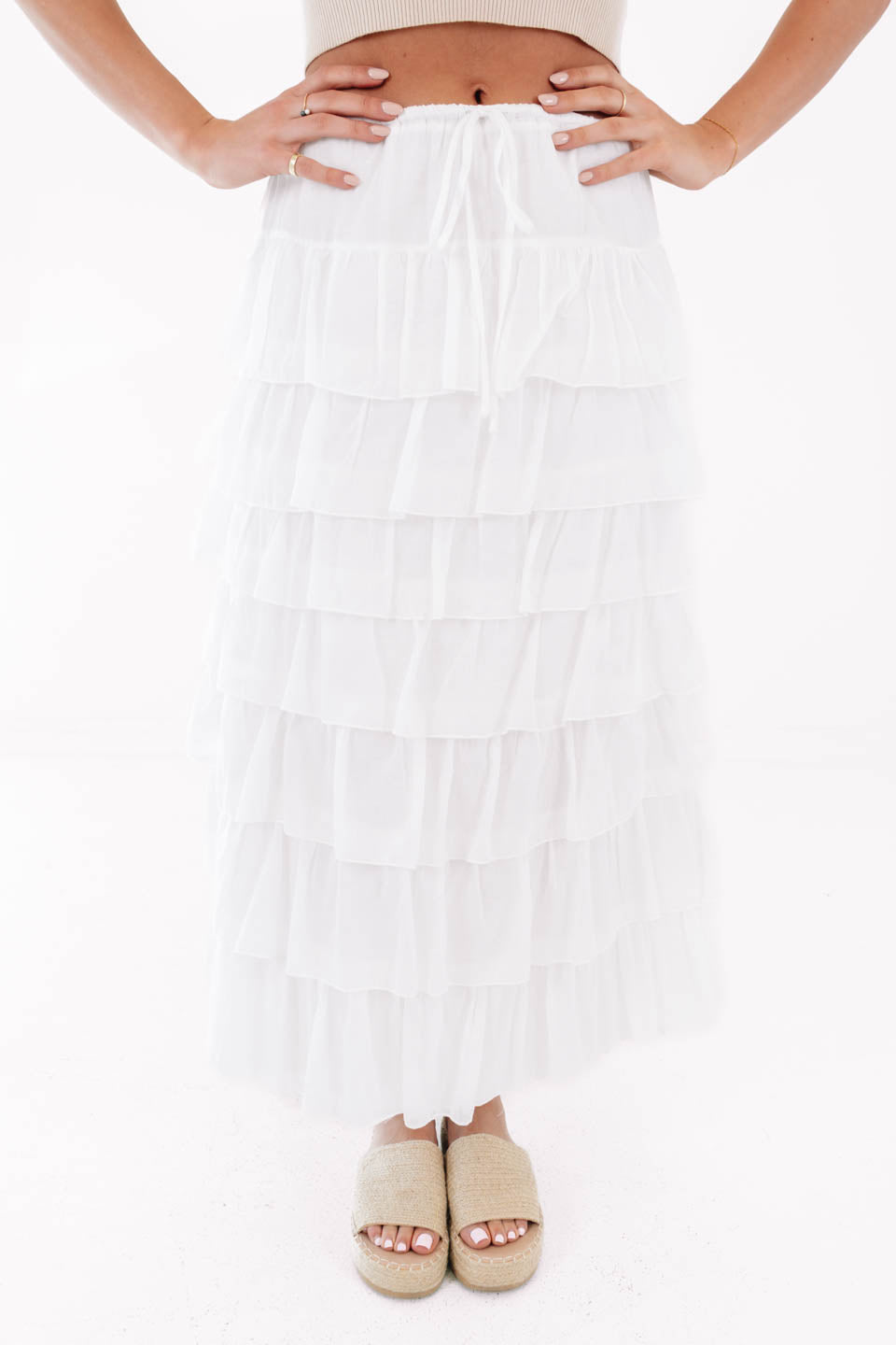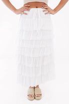Float through your day in this dreamy tiered maxi skirt that’s all about soft, romantic vibes. The breezy layers and comfy drawstring waist make it equal parts effortless and eye-catching. Pair it with a fitted tank and sneakers for a cool-girl contrast or dress it up for a twirl-worthy moment.