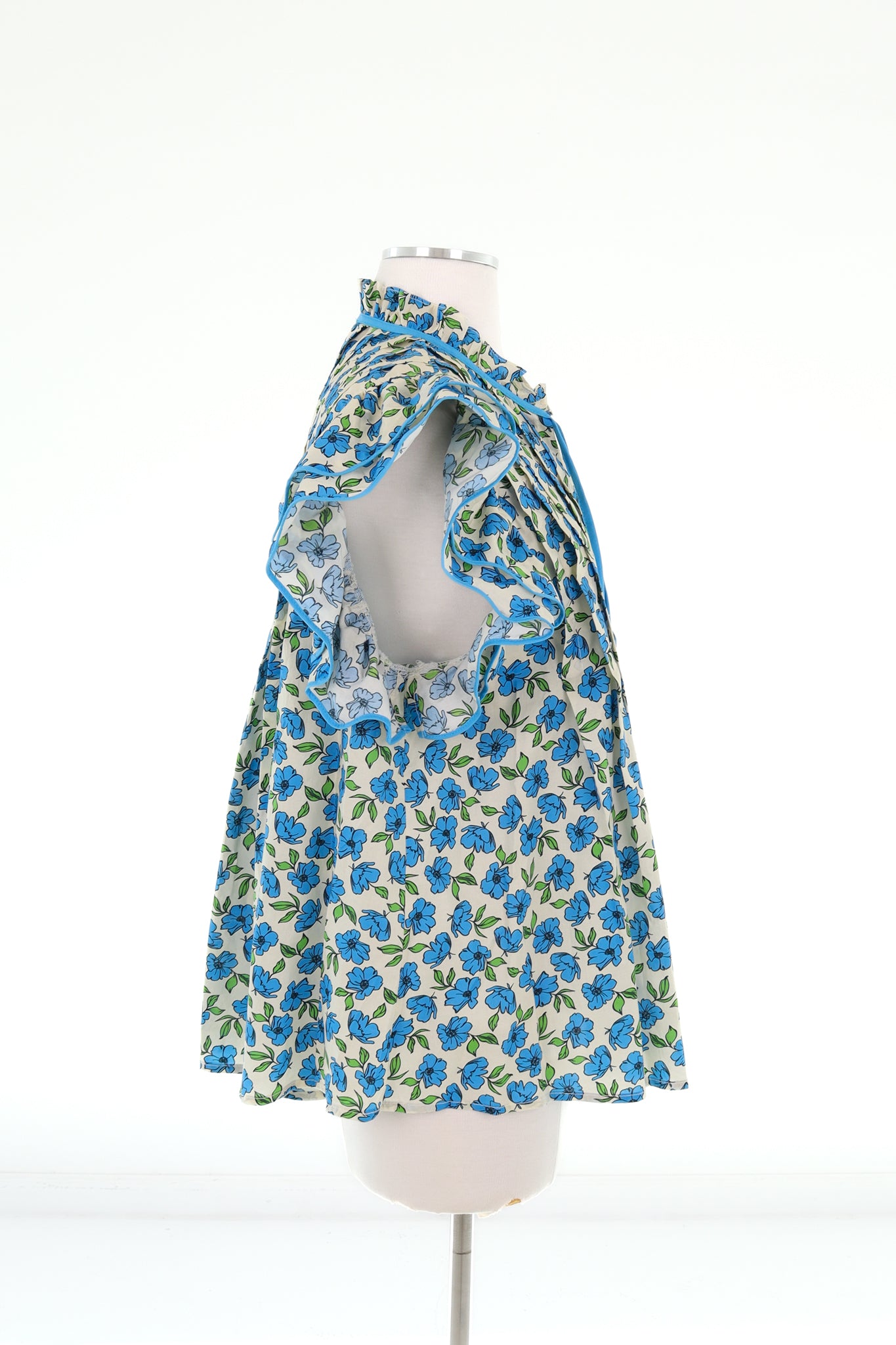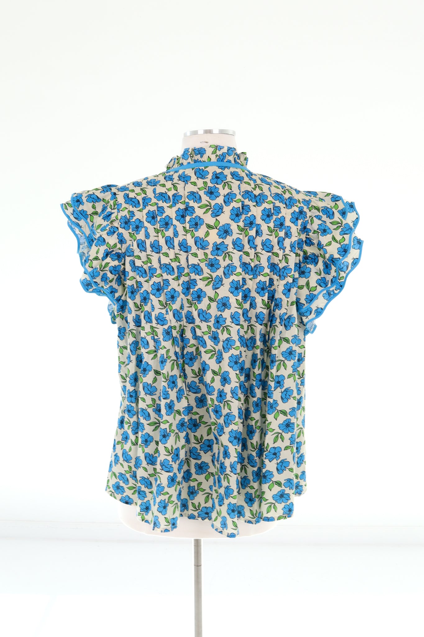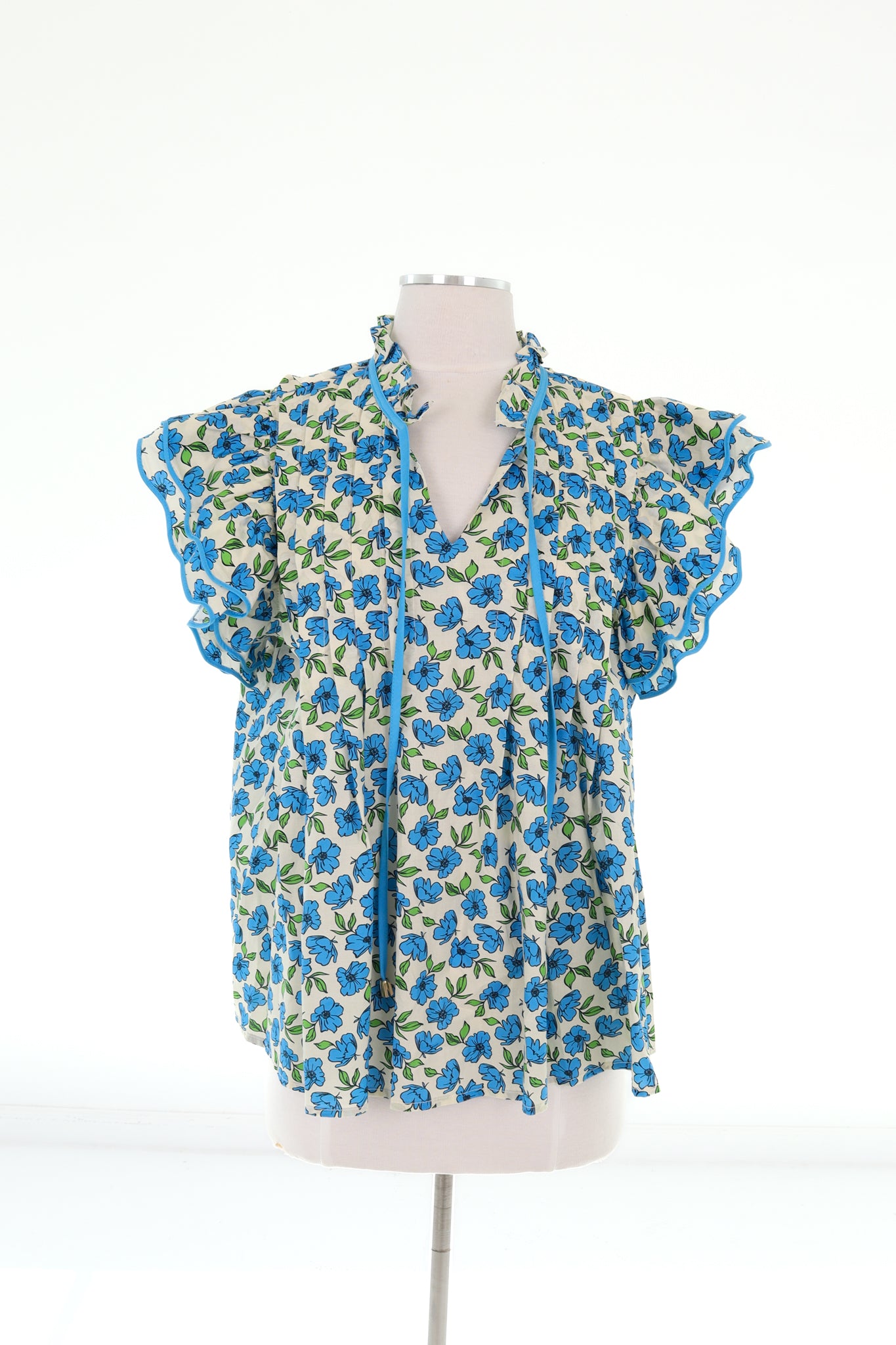 This flirty floral top is bursting with personality, from its ruffled power sleeves to the sweet tie neckline. Drenched in cheerful blue and dainty blossoms, it’s basically sunshine in blouse form. Pair it with your fave white jeans and let the compliments bloom!