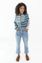This striped sweater is giving cozy-cool vibes with its mix of blues and creamy neutrals. The half-zip detail adds the perfect touch of laid-back charm, making it easy to dress up or down. Pair it with your favorite denim and you’ve got an effortlessly chic look for any casual day out!
