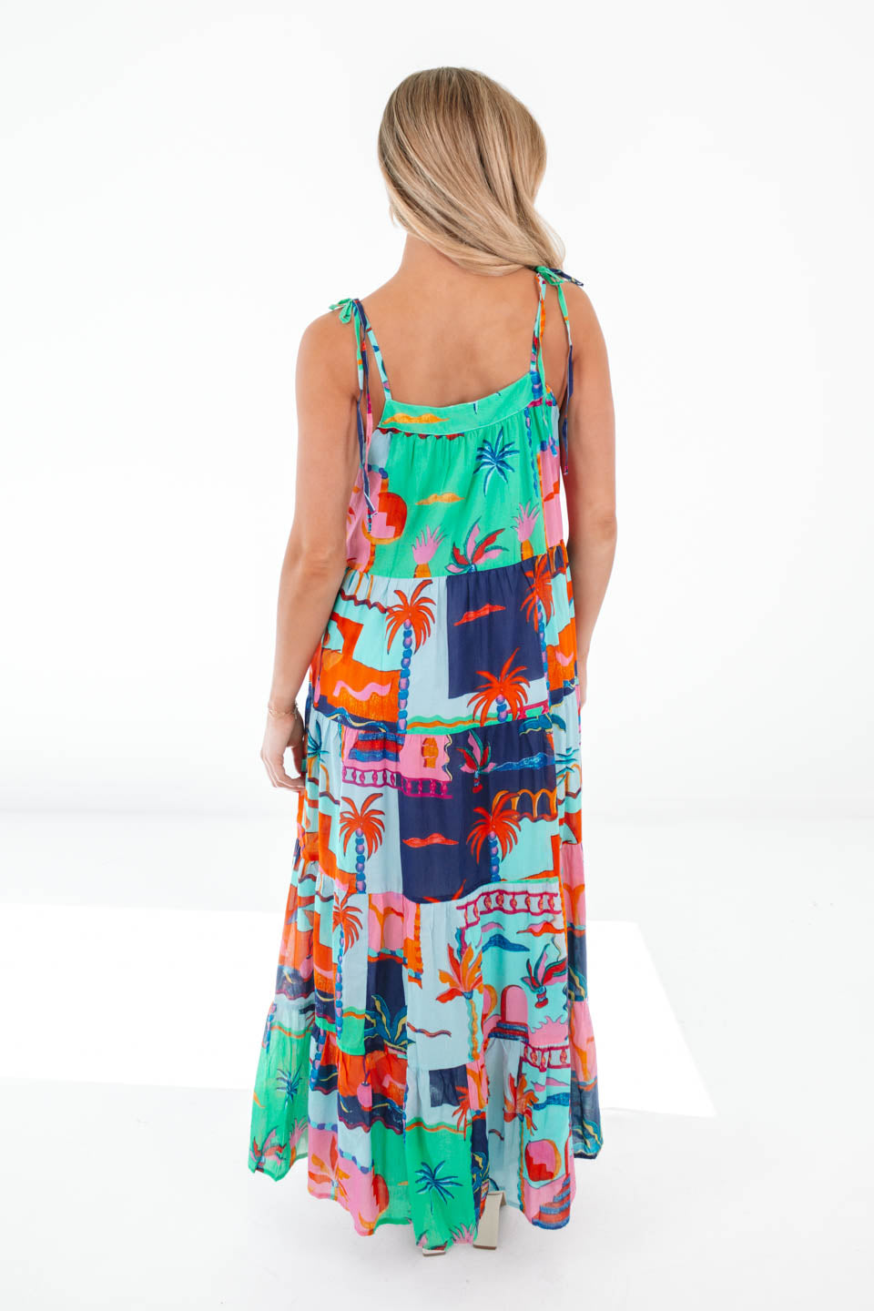 This breezy maxi dress is like a tropical vacation in clothing form! With its playful mix of bright colors and scenic prints, it’s perfect for twirling through summer days and sunset strolls. Lightweight, flowy, and effortlessly chic, this dress is your go-to for major island vibes wherever you go!