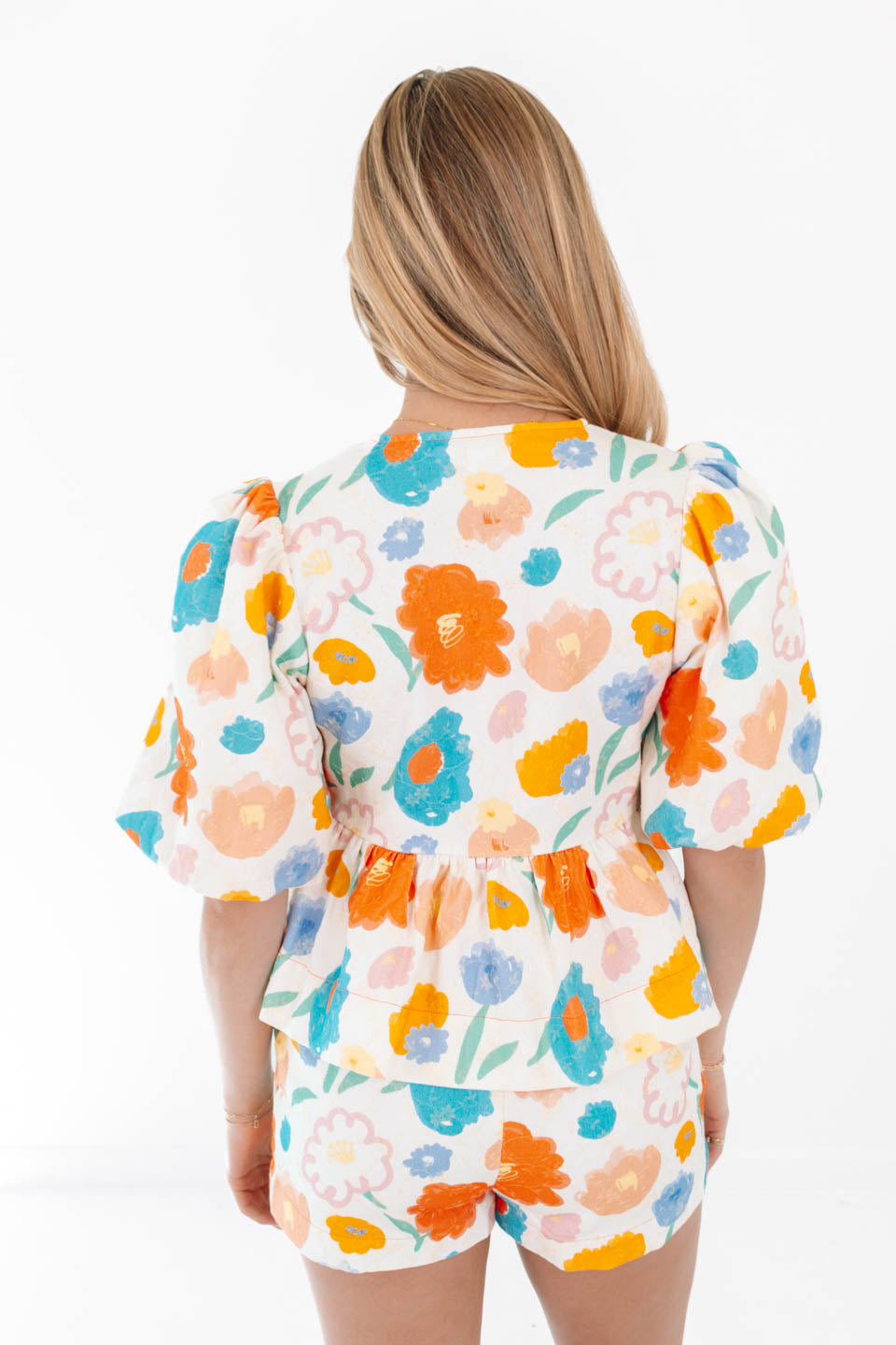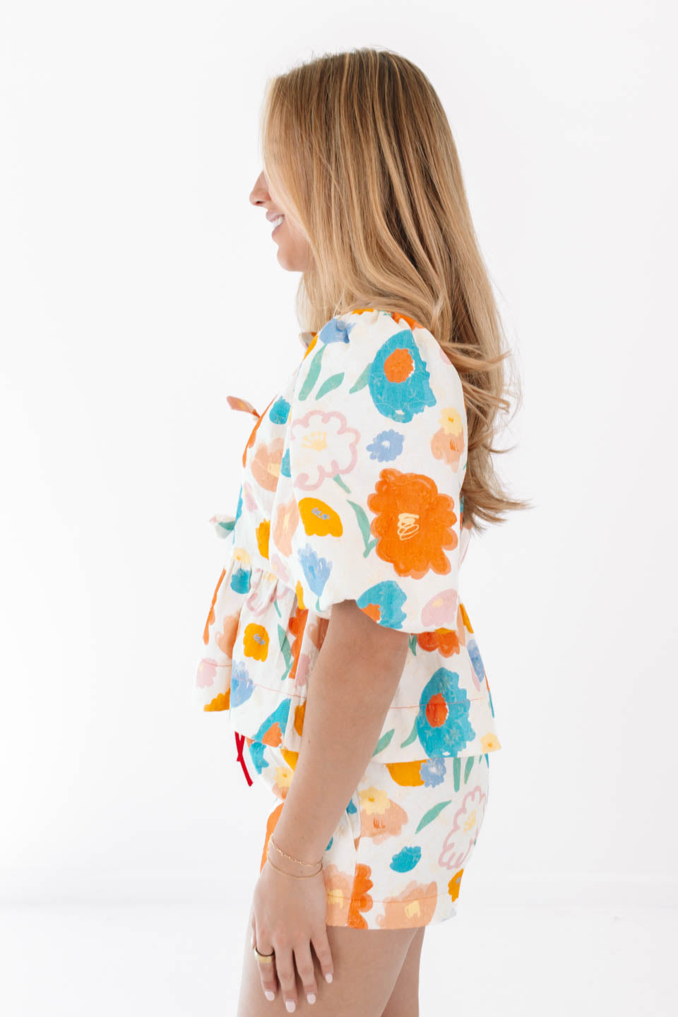 This top is a sunshine-filled dream, bursting with watercolor florals in happy hues of orange, blue, and yellow! The playful puff sleeves and tie-front details add a breezy, effortless charm that’s perfect for poolside lounging or summer brunches. Paired with matching shorts, it’s a head-to-toe look that screams vacation vibes and carefree fun!