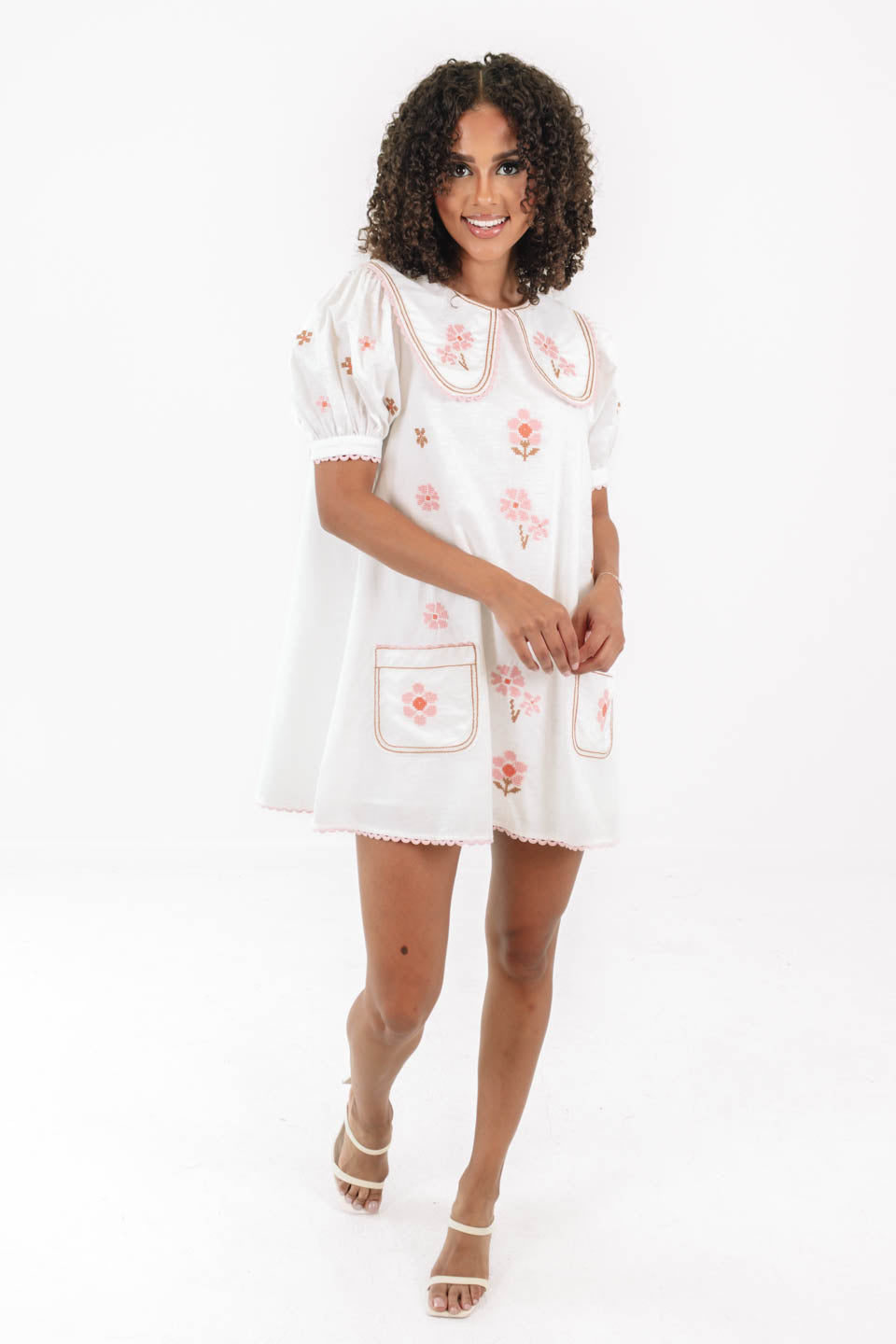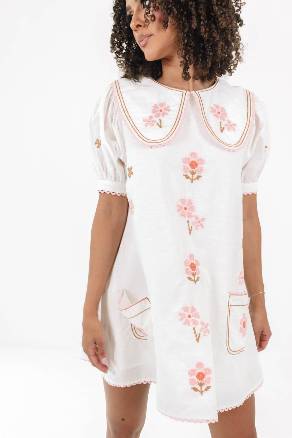 This sweet and playful dress is giving major vintage vibes with its oversized Peter Pan collar and charming pink floral embroidery. Perfect for picnics, twirls, or just feeling extra cute around the house. With its puff sleeves and scalloped trim, it's like wearing a sprinkle of sunshine and nostalgia!