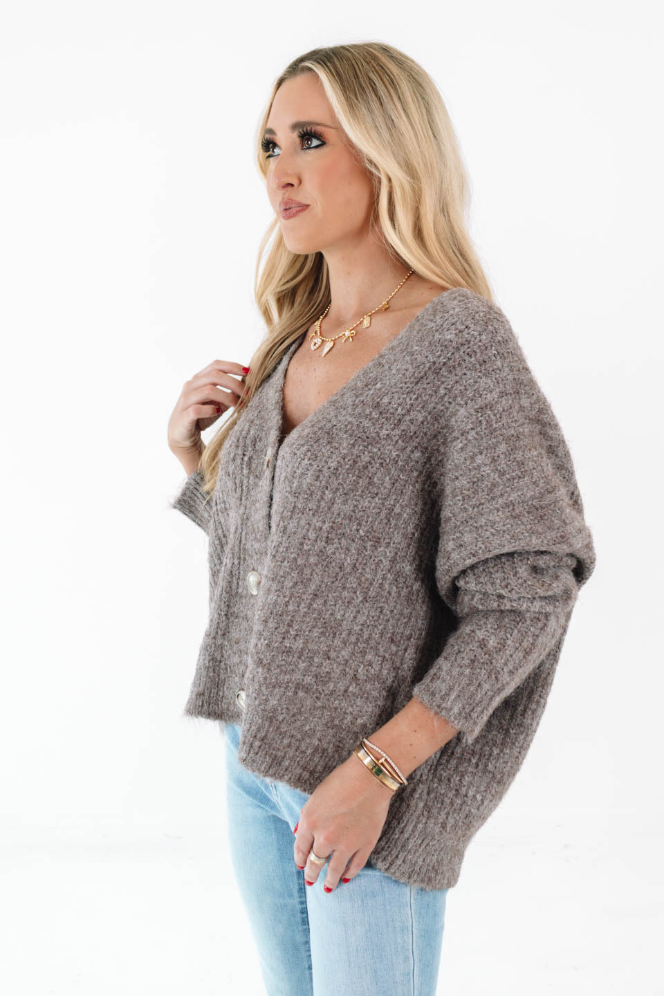 This cozy mauve cardigan is like a warm hug you can wear all day! Its soft, chunky knit and slouchy fit make it perfect for lazy Sundays or layering over your favorite outfit. With its deep V-neck and button-up style, it’s effortlessly chic and ready for coffee dates or couch cuddles!