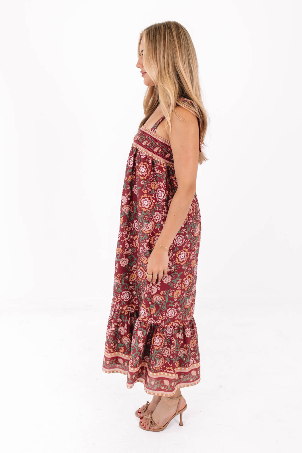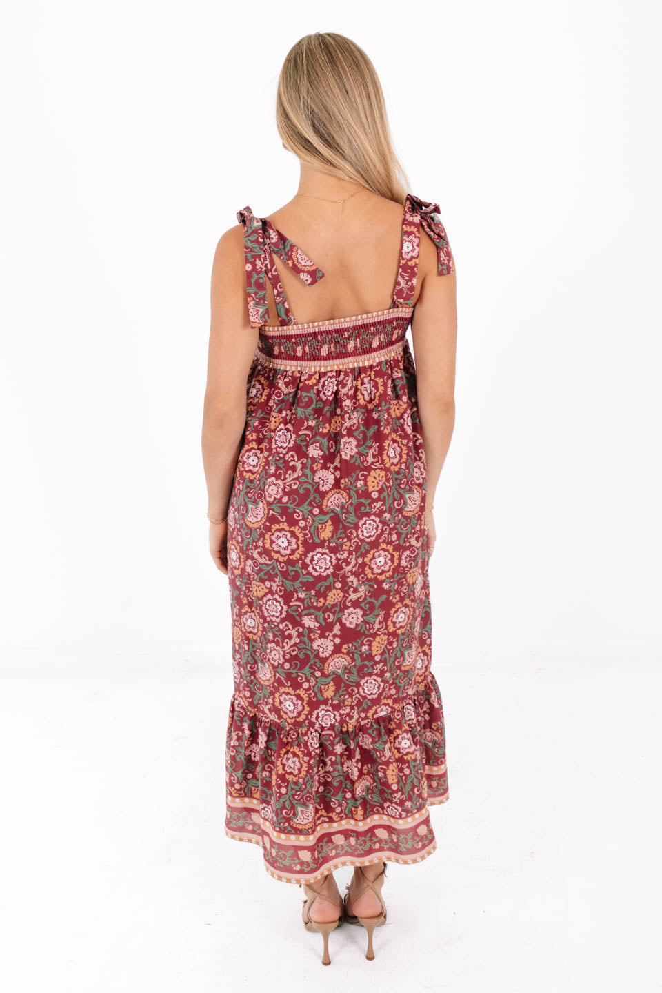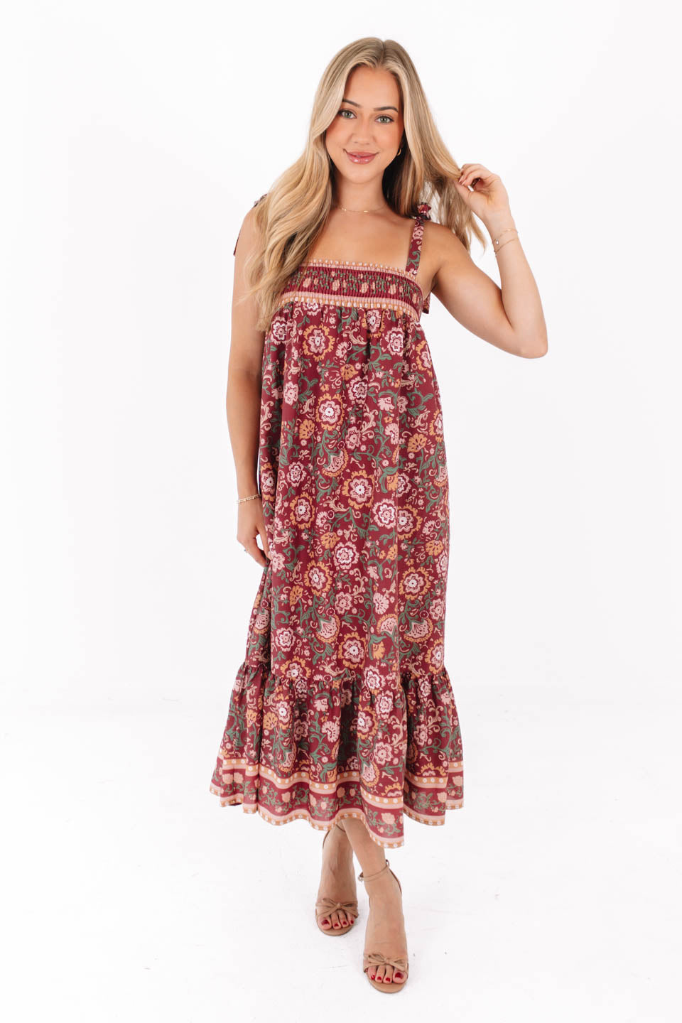 This flowy floral midi dress is made for twirling through sunny days and breezy evenings. With its smocked top, tie straps, and boho-inspired print, it’s equal parts comfy and chic. Just add sandals or wedges, and you’ve got the ultimate effortless outfit!