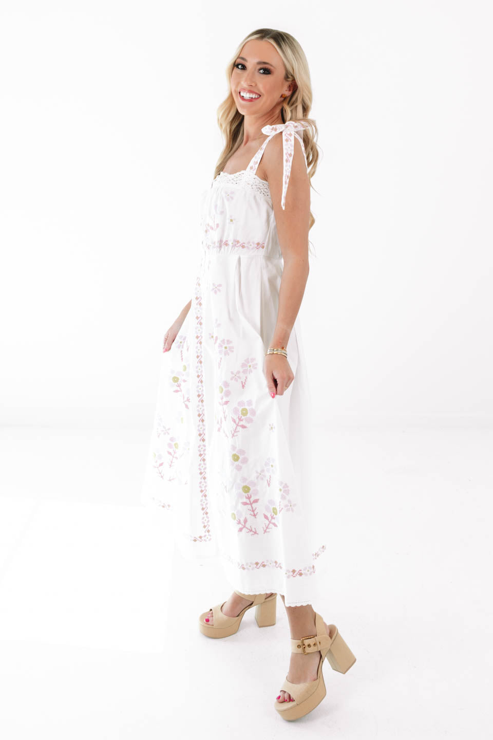 Float through sunny days in this dreamy, vintage-inspired sundress, complete with delicate floral embroidery and charming tie straps. The breezy silhouette and front button details make it perfect for twirling through a garden party or strolling along a coastal boardwalk. Pair it with your favorite wedges, and you’re instantly the embodiment of effortless romance!