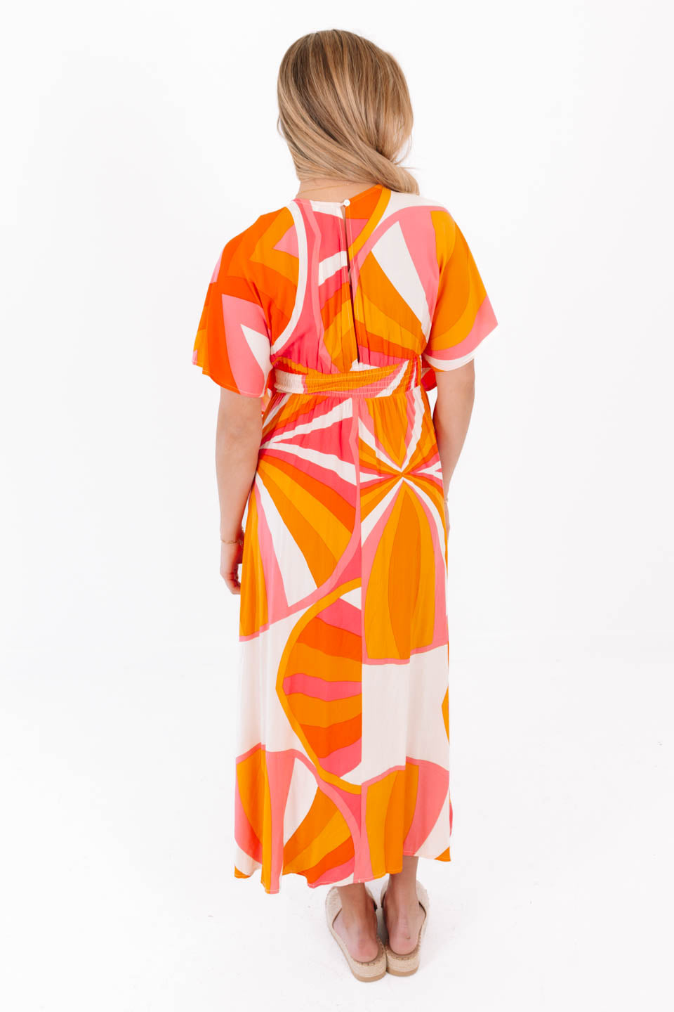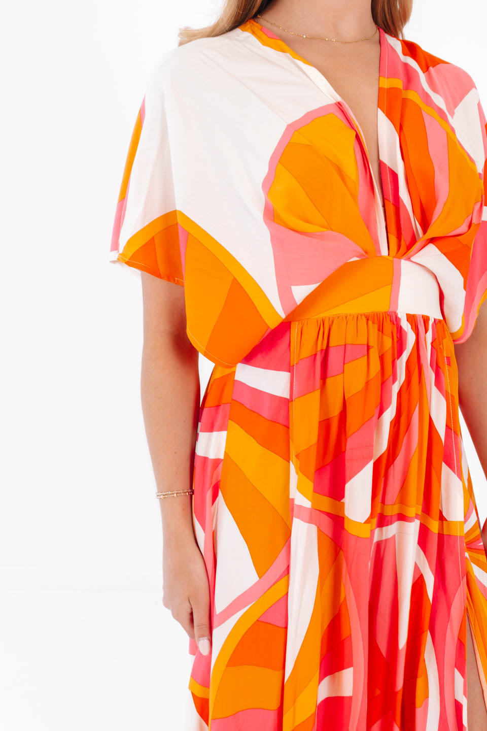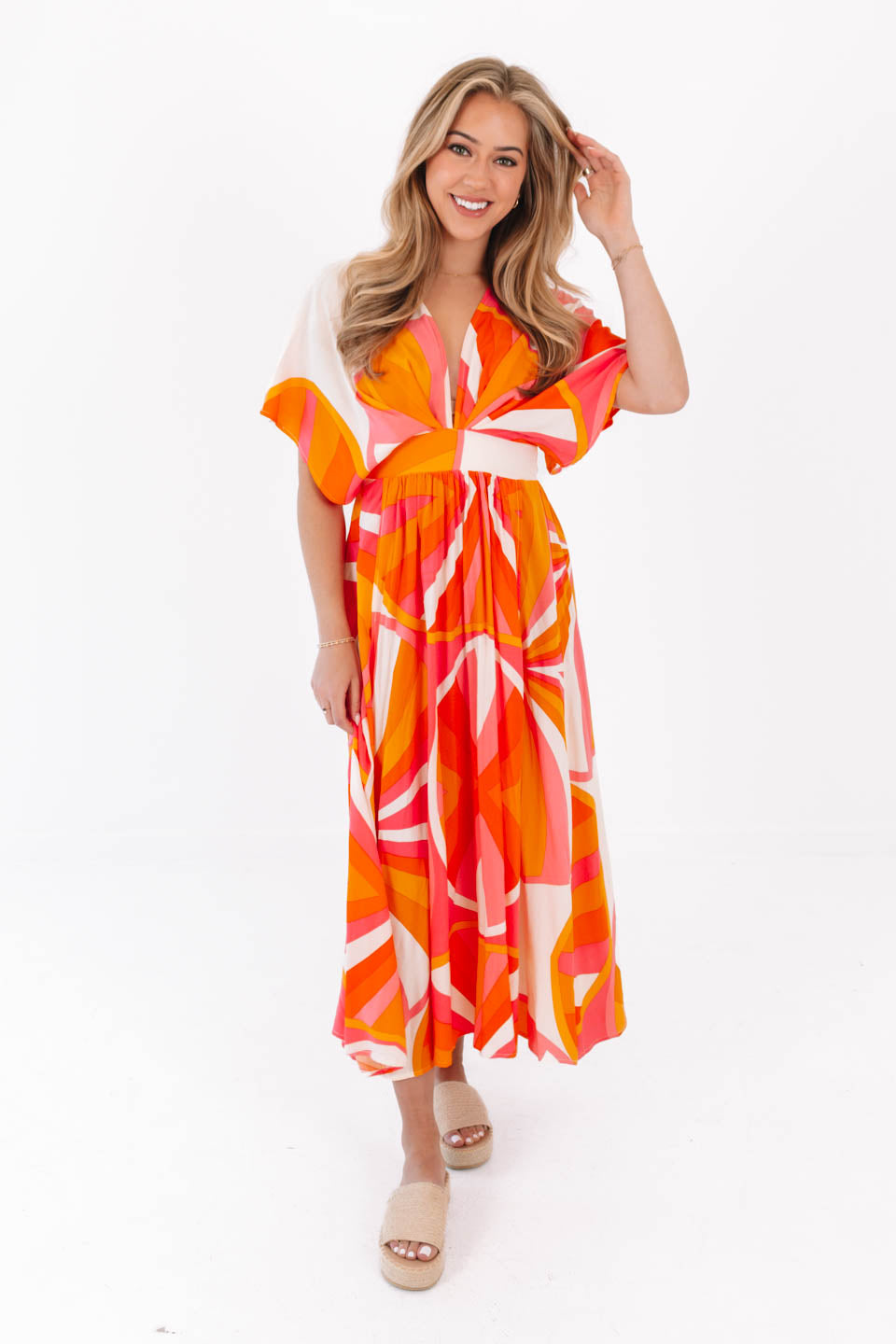 Turn heads and steal the spotlight in this vibrant, flowy maxi dress that screams tropical getaway! With bold splashes of orange, pink, and white swirling together, it’s like wearing a sunset on the beach. The deep V-neck and sultry thigh-high slit add just the right amount of sass, making this the perfect look for sipping cocktails by the ocean or dancing the night away!