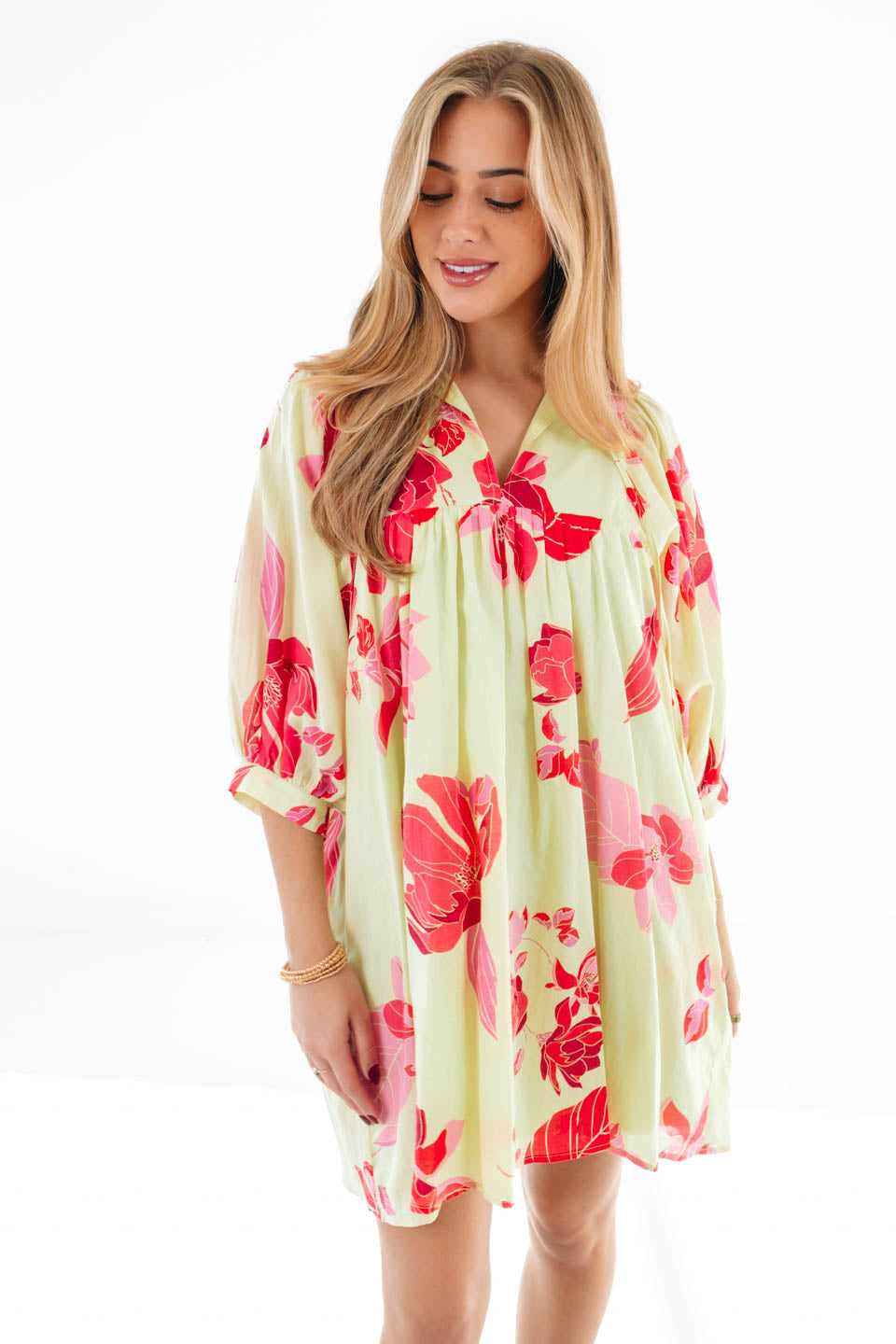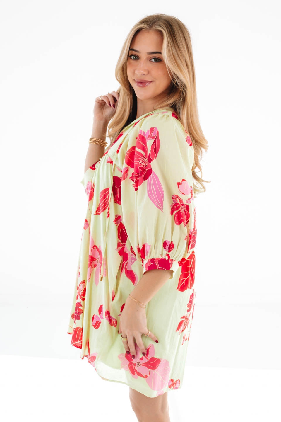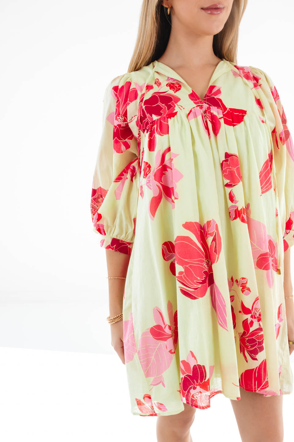This charming dress features a light green fabric adorned with a tropical pink floral print, offering a soft and feminine look. With three quarter sleeves and a flowy silhouette, it’s both comfortable and flattering. The front tie at the neckline adds a touch of detail, making this dress perfect for both casual outings and more polished occasions.
