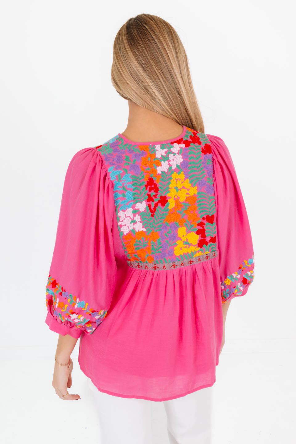 This pink top features a fresh embroidery, adding pops of color and detail to your look. With 3/4 sleeves and a flattering V-neck, the flowy design ensures both comfort and style. Perfect for adding a bold, feminine touch to your wardrobe, this dress is ideal for both casual and dressed-up occasions!