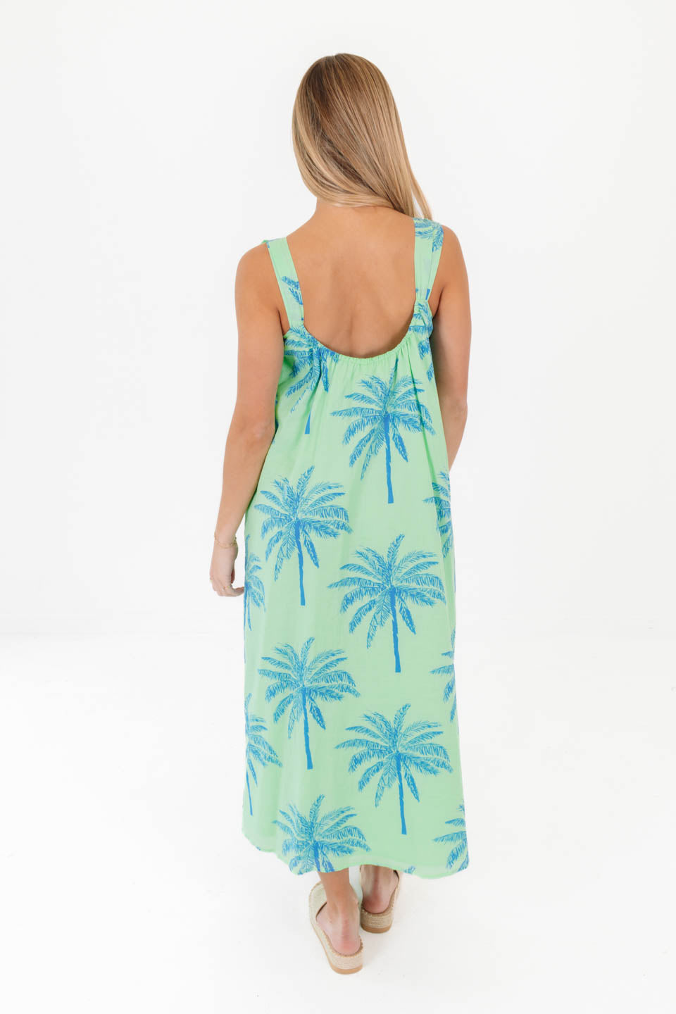 This playful midi dress features a tropical blue print, bringing a fresh and flirty feel to your wardrobe. With flower strap detail and beaded ties adds a playful touch. Perfect for a spring outing or special occasion, this dress combines style and comfort effortlessly!