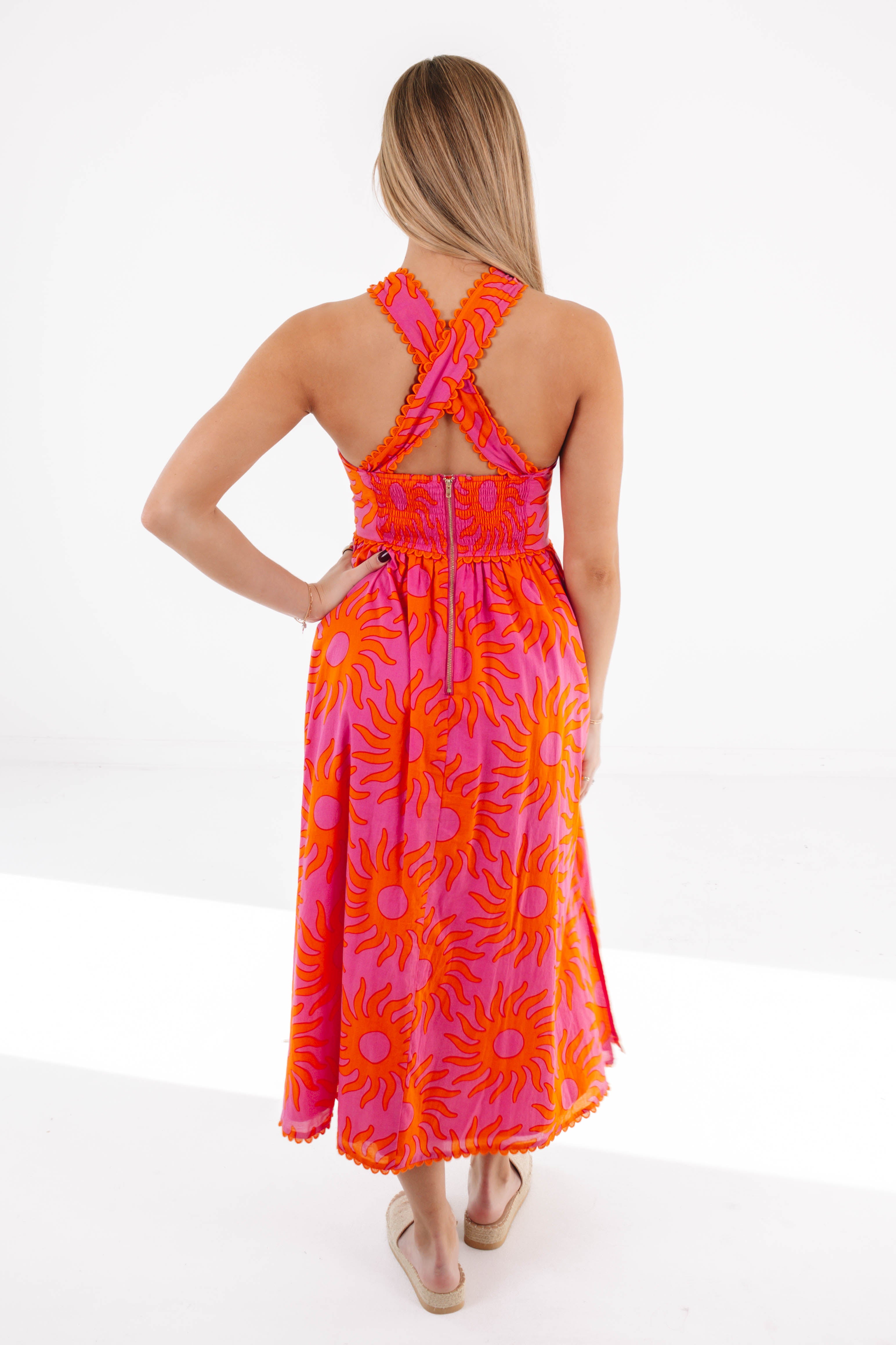 This charming pink midi dress features an orange sun print, bringing a fresh and feminine feel to your wardrobe. With ric rac detail adding a playful touch, front cross straps create a flattering sun-kissed look, while the back zipper ensures a sleek fit. Perfect for a spring outing or special occasion, this dress combines style and comfort effortlessly.
