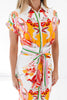 Bright, bold, and bursting with personality — this printed midi dress is a total mood booster. Featuring a playful mix of vibrant florals and intricate patterns, plus a flattering tie waist and chic button-front detail, it’s made to turn heads. Just add your favorite sandals and get ready to shine from brunch to beachside strolls.