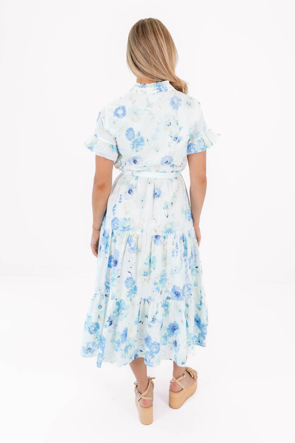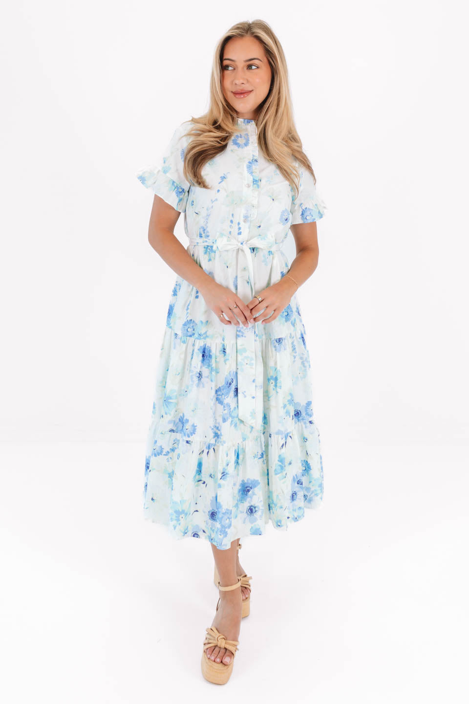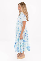 This playful midi dress features button up neckline & ruffle sleeves, adding a touch of charm & movement. With its flowy silhouette & convenient pockets, it's both stylish & practical—perfect for casual outings or a laid-back day of fun!