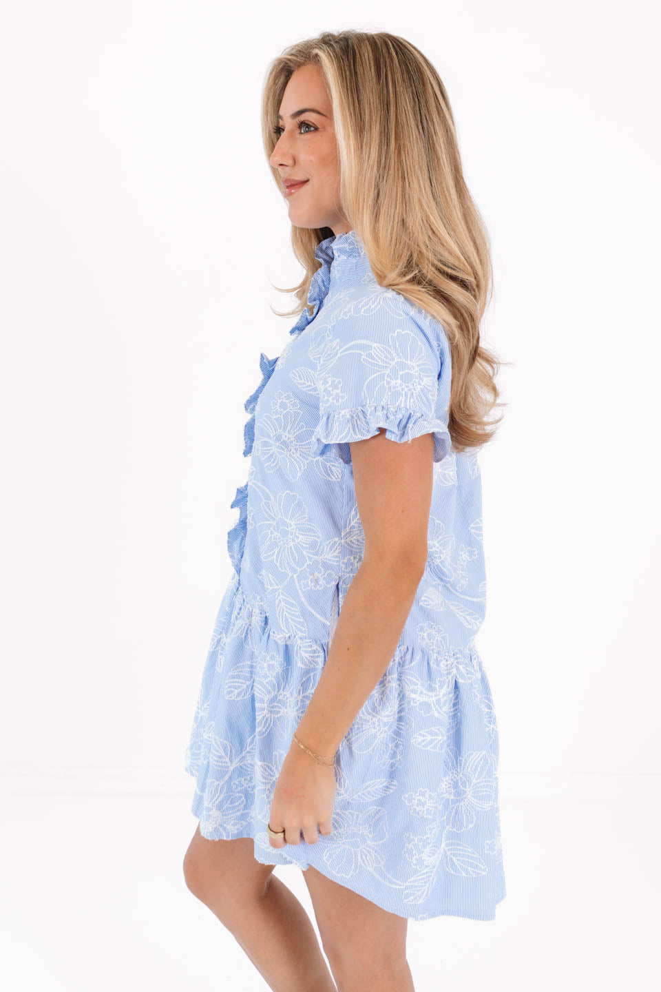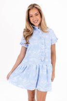 This playful short dress features button up neckline & ruffle sleeves, adding a touch of charm & movement. With its flowy silhouette & convenient pockets, it's both stylish & practical—perfect for casual outings or a laid-back day of fun!