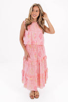 This feminine button-up top features delicate pink floral print, adding a romantic touch to your spring wardrobe. With its lightweight feel & easy, flattering fit, it’s both polished & effortless—perfect for pairing with the Emery Midi Skirt for brunch dates, weekend strolls, or any sunny day outing!