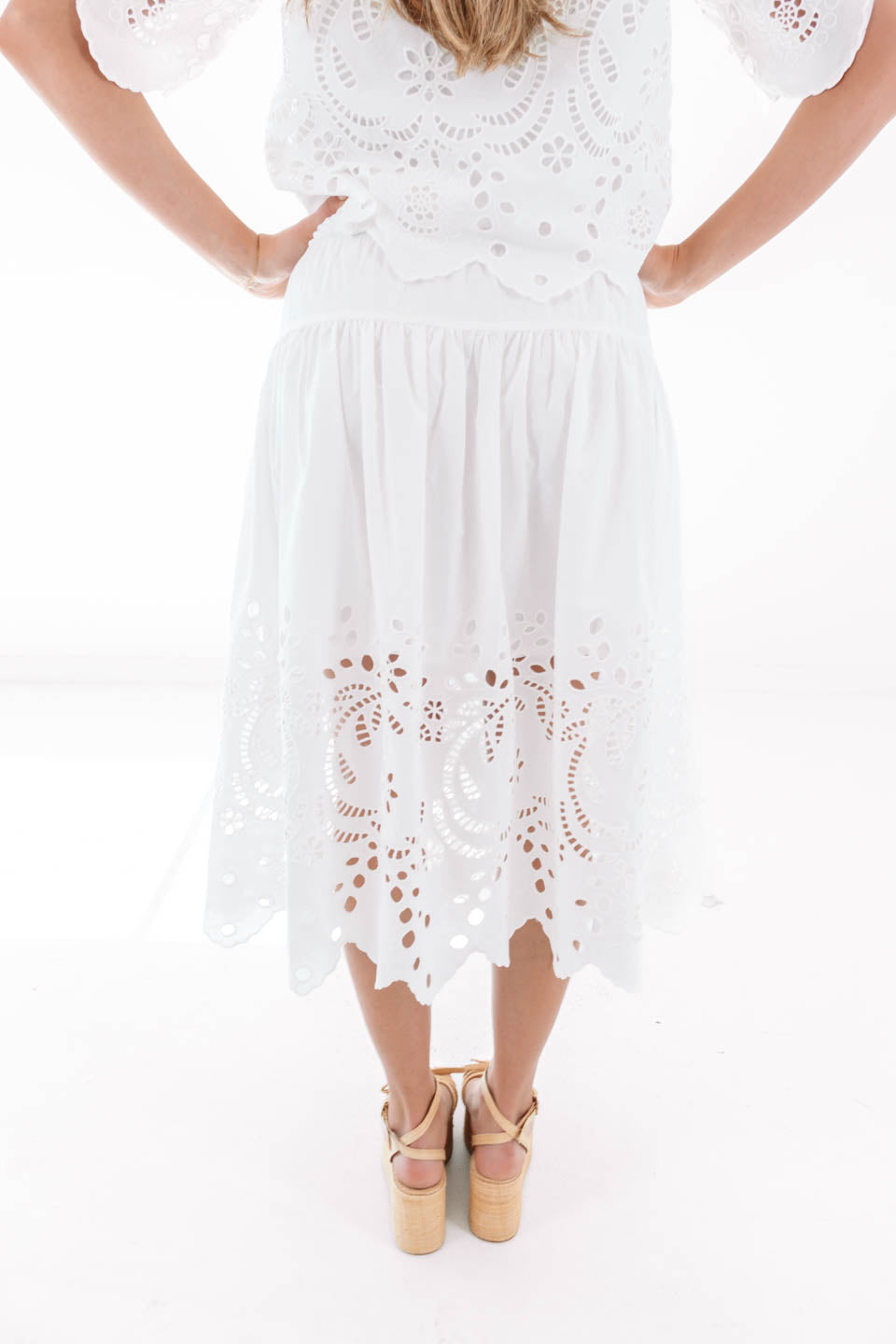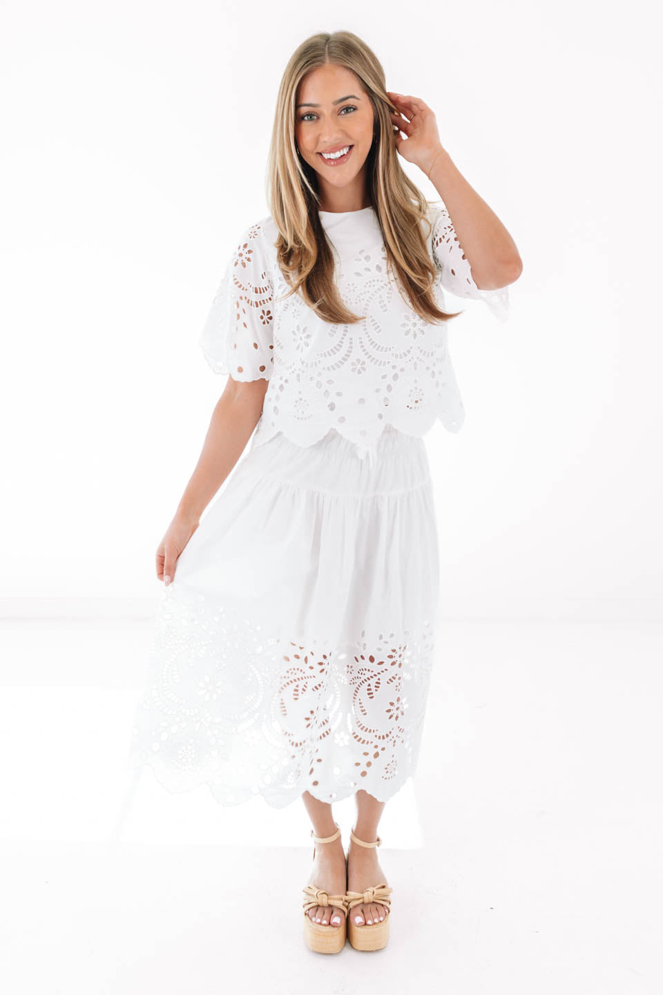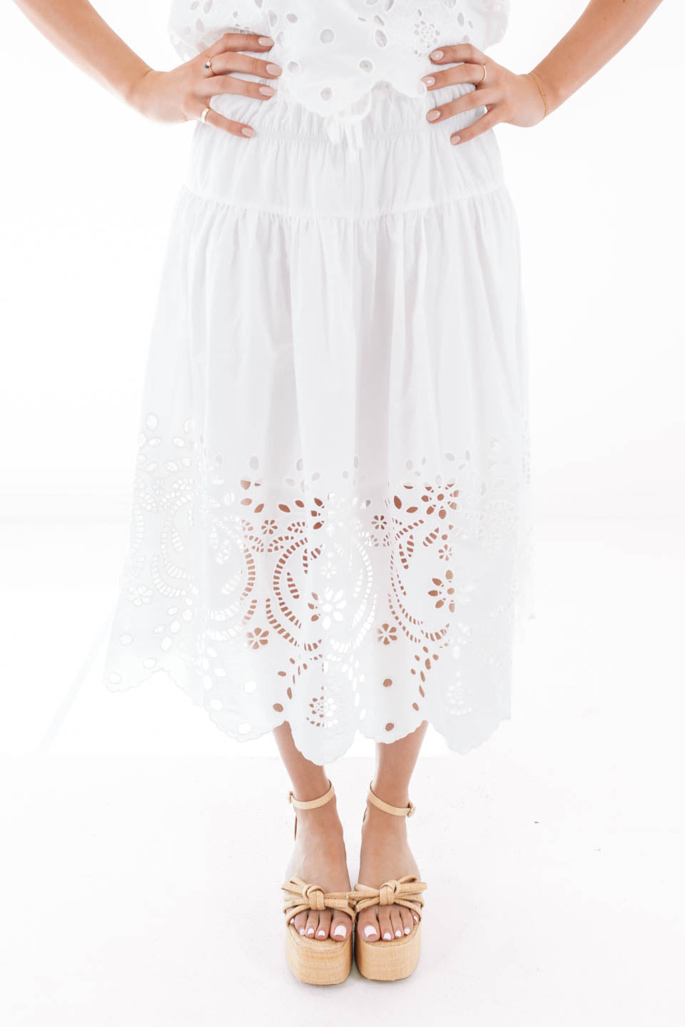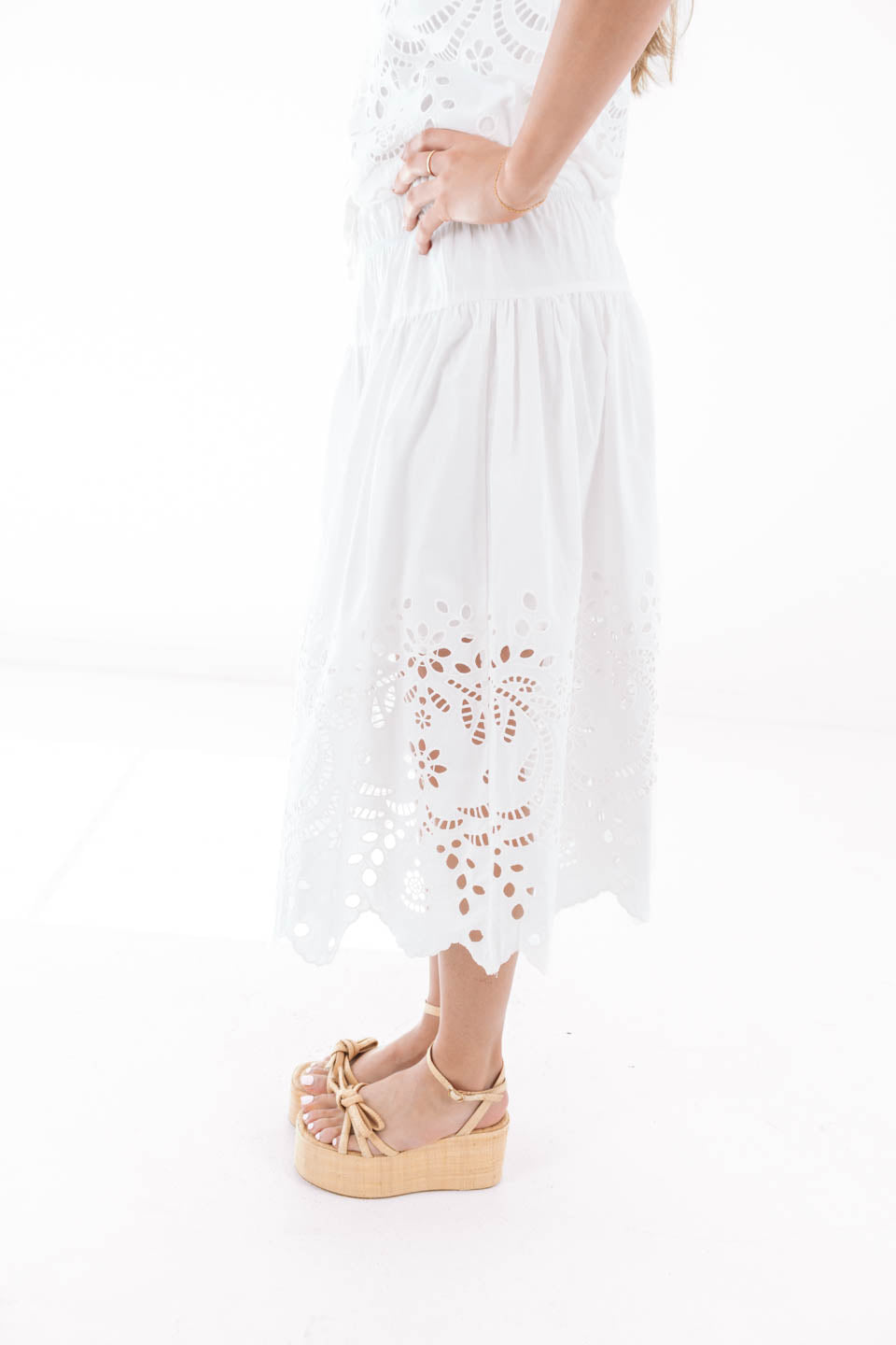 This breezy midi skirt is all about effortless charm with its flowy silhouette and delicate eyelet detailing along the hem. The comfy elastic waistband with a sweet ruffle trim makes it as easy to wear as it is to love. Dress it up with heels or keep it cool with sneakers for that perfectly playful, everyday vibe.