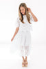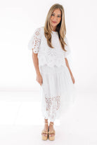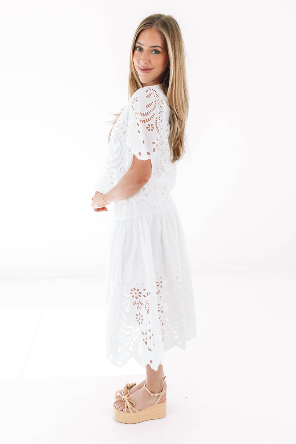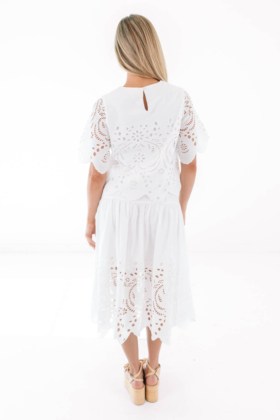 This eyelet top is giving effortlessly chic with its dreamy cutout details and breezy flutter sleeves. The scalloped hem adds a sweet, feminine touch that’s perfect for dressing up your favorite denim or crisp white bottoms. Light, airy, and oh-so-pretty, it’s basically sunshine in blouse form.