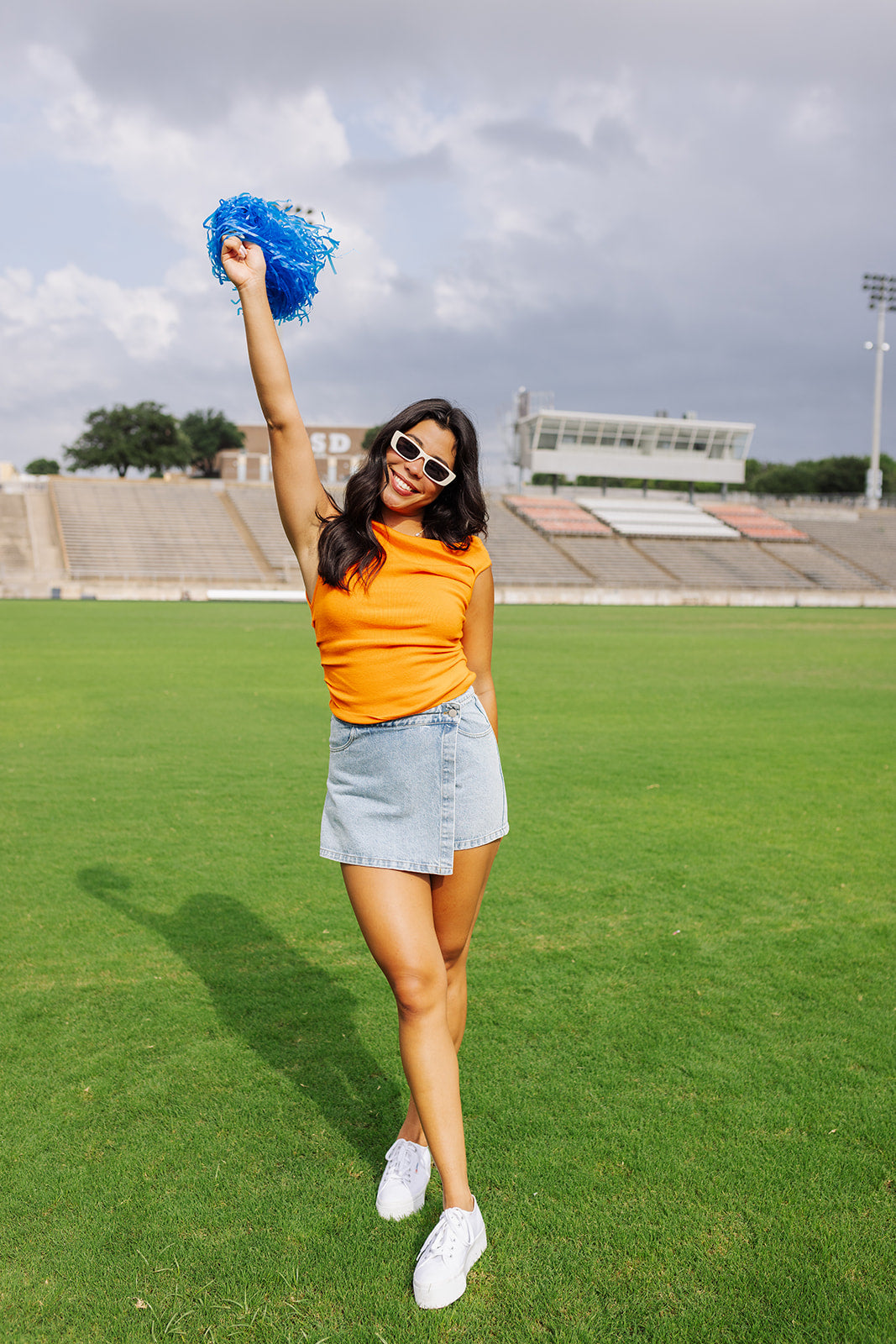 Show off your team spirit with a twist in this bold orange one-shoulder top made for the ultimate gameday glam. The asymmetric neckline brings the drama while the sleek fit keeps it effortlessly cool. Pair it with a pleated skirt or denim for a look that screams school pride with style!