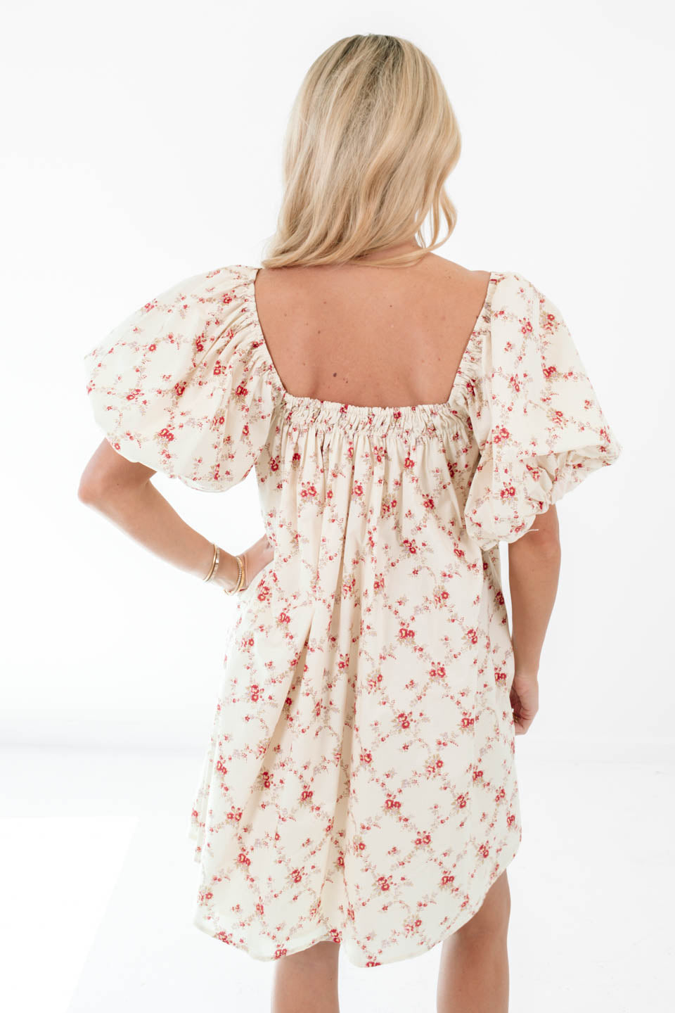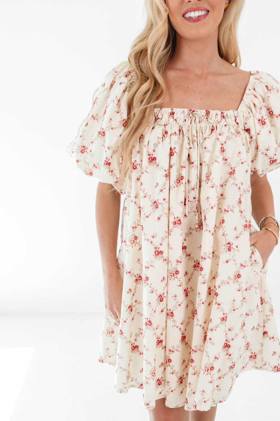A dreamy, flowy babydoll dress like this one is made for twirling through gardens, outdoor picnics, or even a casual summer wedding. The delicate red floral pattern on the cream background, combined with its puff sleeves and tie neckline, gives off the perfect romantic and vintage vibe. Pair it with nude heels, pearl earrings, and a straw hat for the ultimate effortlessly elegant ensemble!