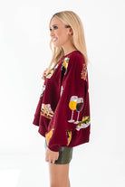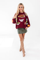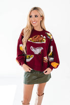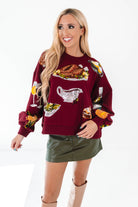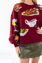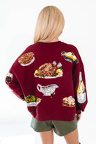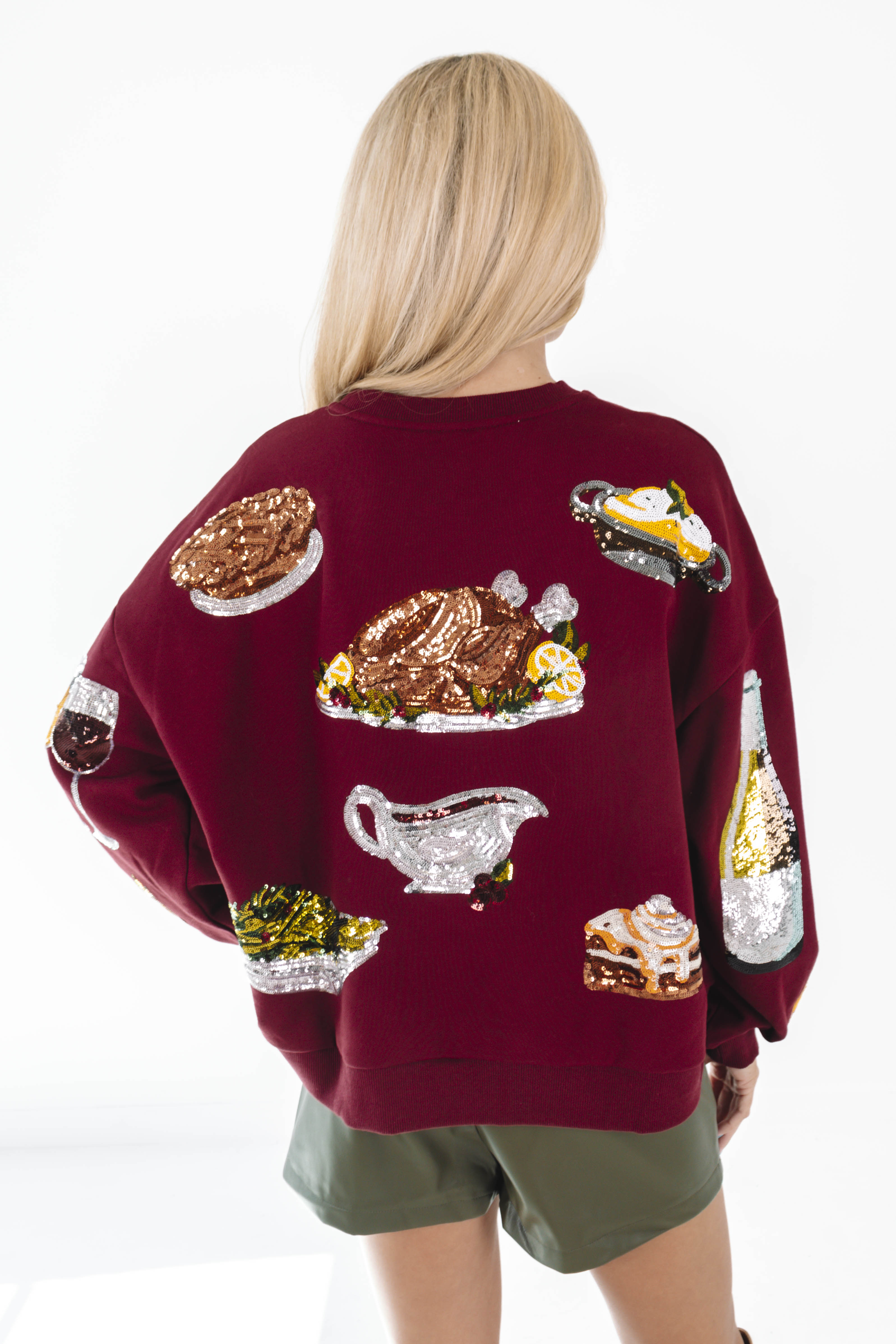 This festive sweatshirt is serving up all the holiday vibes with its sequin-embroidered feast, featuring everything from roast turkey to pie! The maroon backdrop adds a cozy, casual touch, while the sparkly details make it a fun and quirky statement piece. Whether you're at a holiday gathering or just in the mood to celebrate, this sweatshirt will definitely get you in the spirit!
