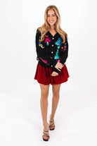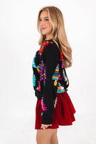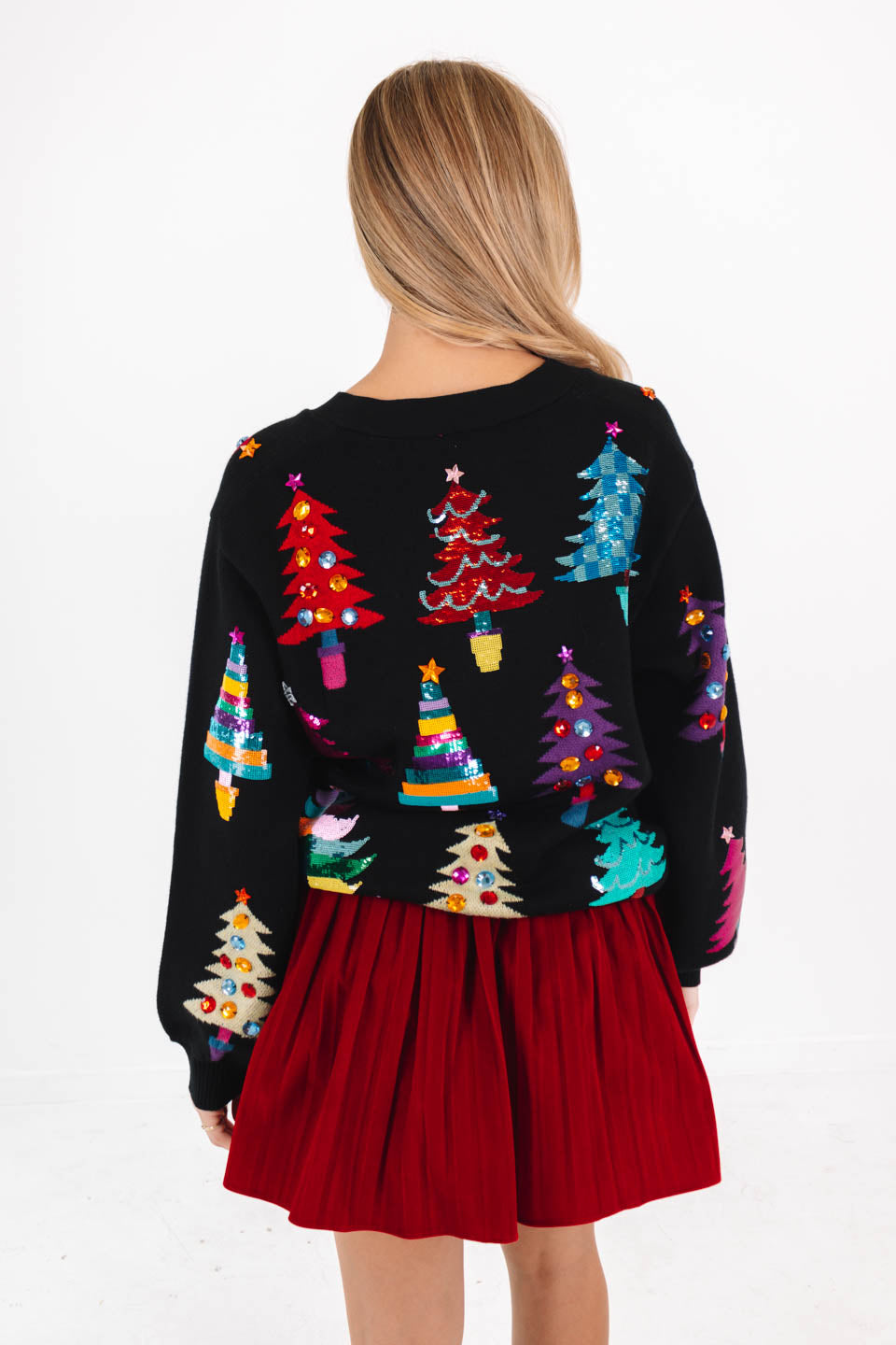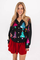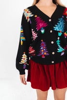 This cardigan is a festive explosion of holiday cheer! With colorful, sequin-adorned Christmas trees on a cozy black knit, it’s the perfect way to sparkle through the season. Whether at a holiday party or a casual winter day out, this cardigan is here to make spirits bright!
