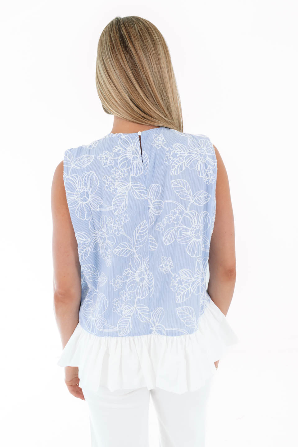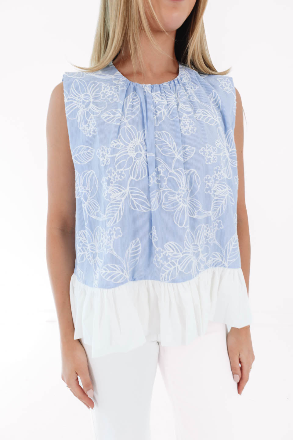 Sweet, breezy, and effortlessly chic, this light blue floral top is made for sunshine-filled days! The delicate white outline blooms and soft pleated peplum hem add the perfect touch of feminine flair and movement. Pair it with your favorite denim for an easy look that feels as fresh as a spring morning!