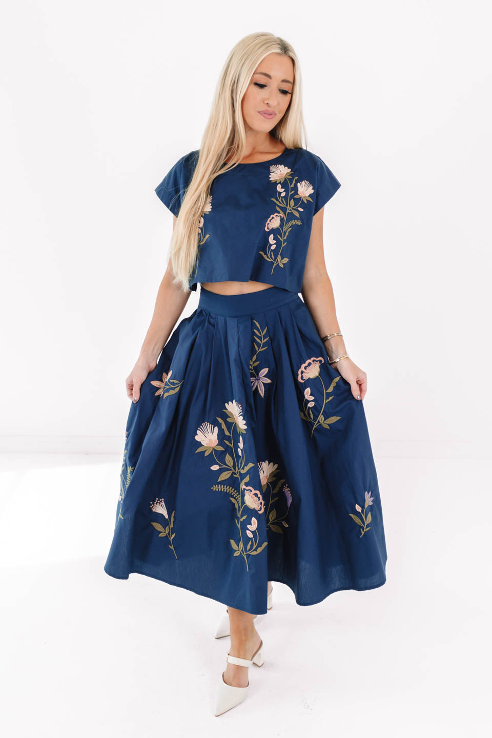 This breezy navy crop top is a little garden dream come true! The floral embroidery adds a touch of whimsy, while the boxy fit keeps things effortlessly chic. Perfect for sunny strolls, brunch dates, or twirling through flower fields.