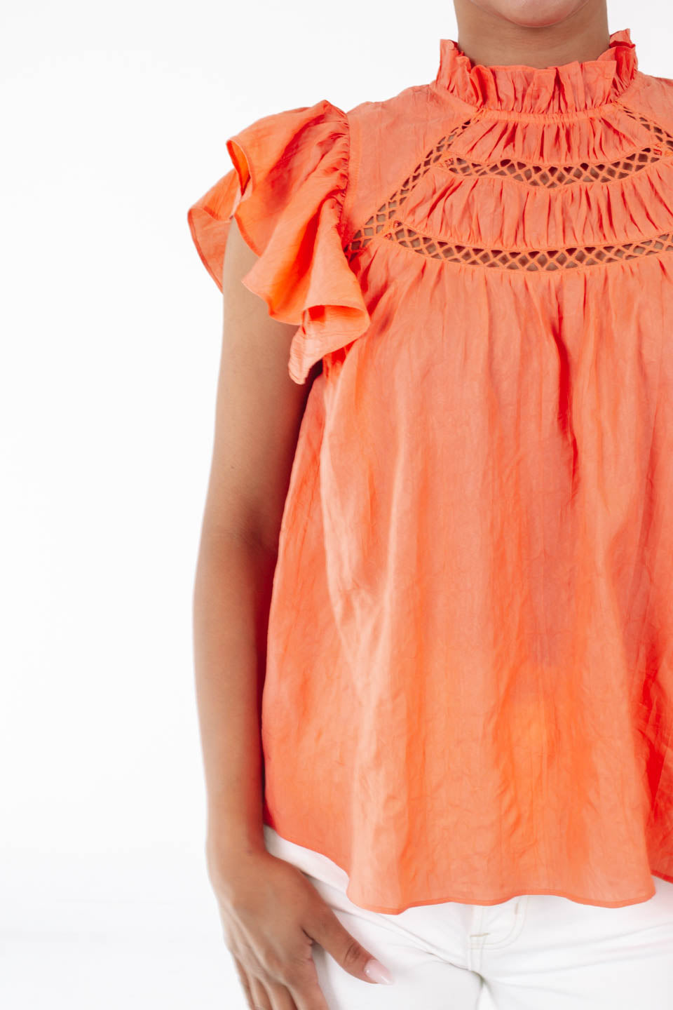 Bursting with vibrant orange hues, this playful top is a sunny day essential that radiates cheerfulness. The flirty ruffled sleeves and intricate lace details add a touch of boho chic, making it perfect for carefree adventures. Pair it with your favorite white jeans for a look that’s as refreshing as a summer breeze!