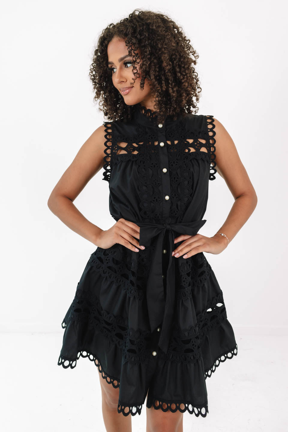 This black eyelet dress is a total showstopper with its dreamy lace details and pearl buttons! The high neck and scalloped edges give it that perfectly polished princess vibe, while the waist tie keeps it sweet and flattering. It's like wearing a summer breeze—cool, chic, and ready to twirl!