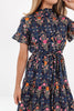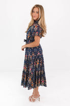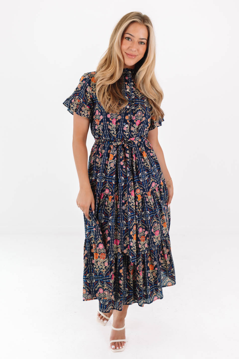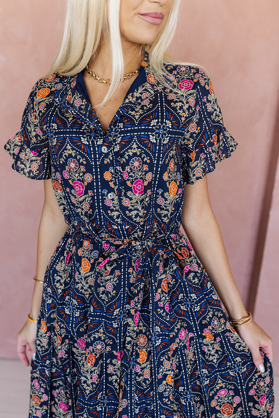 This charming navy midi dress showcases a bold print and a flattering adjustable tie waist for a timeless, feminine look. The button-up neckline and short sleeves add a classic touch, making it effortlessly polished. With its warm tones and easy silhouette, it’s the perfect piece for fall outings or brunch dates.