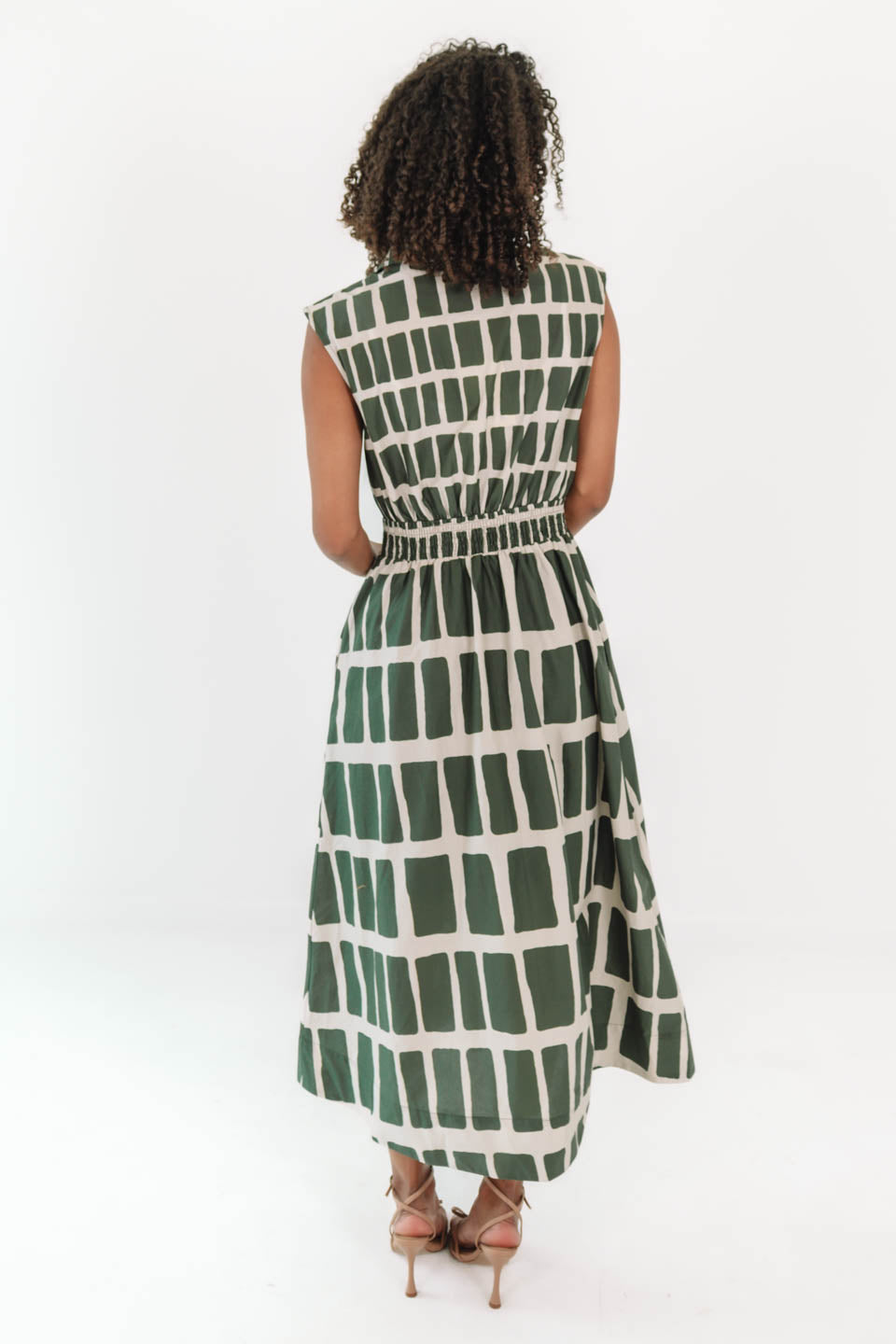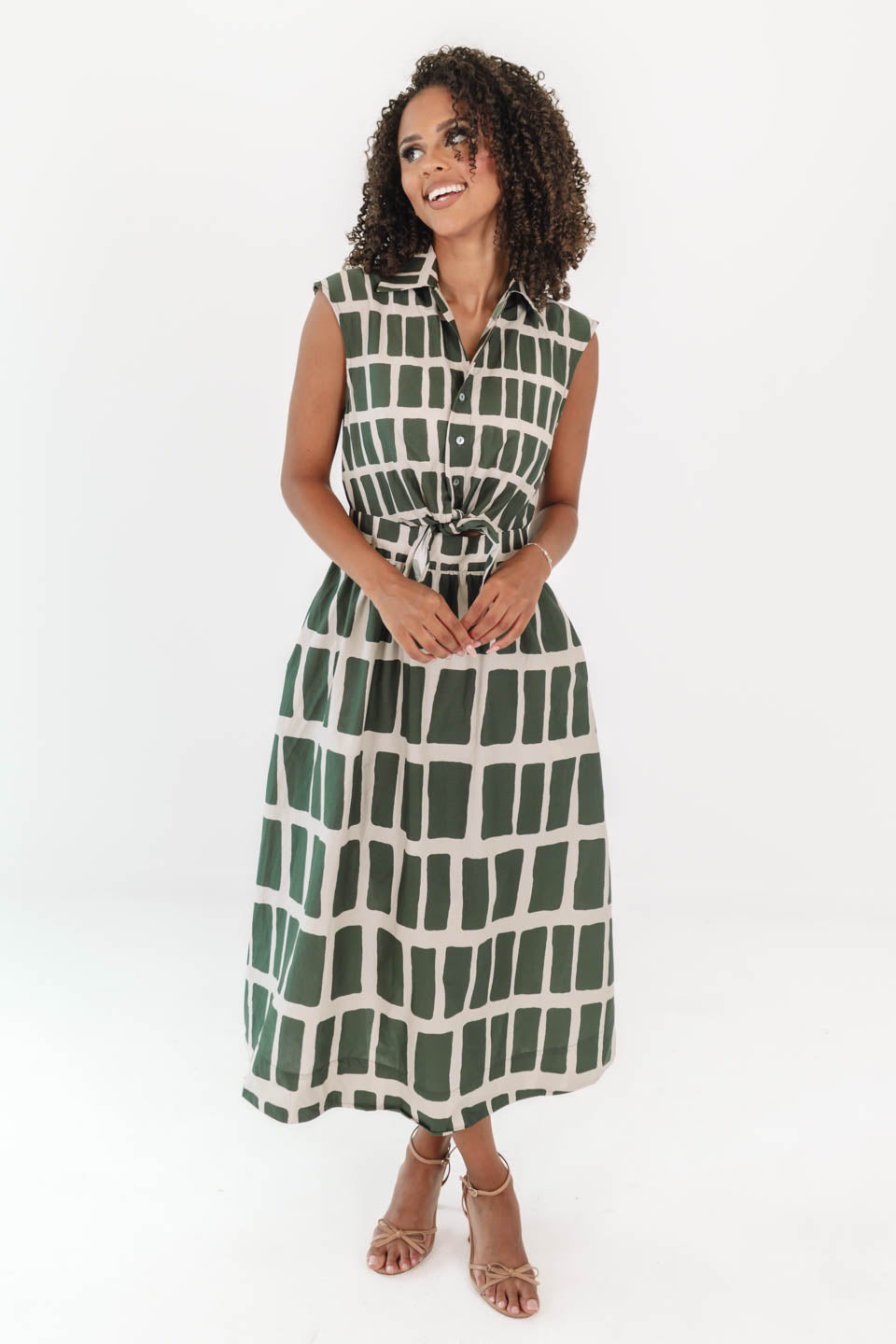 This dress is serving up modern art vibes with a fresh, playful twist! The bold grid print and button-down style keep it cool and effortless, while the tie waist adds just the right amount of shape. Whether you're headed to a gallery stroll or a sunny brunch, this look is a total conversation starter.
