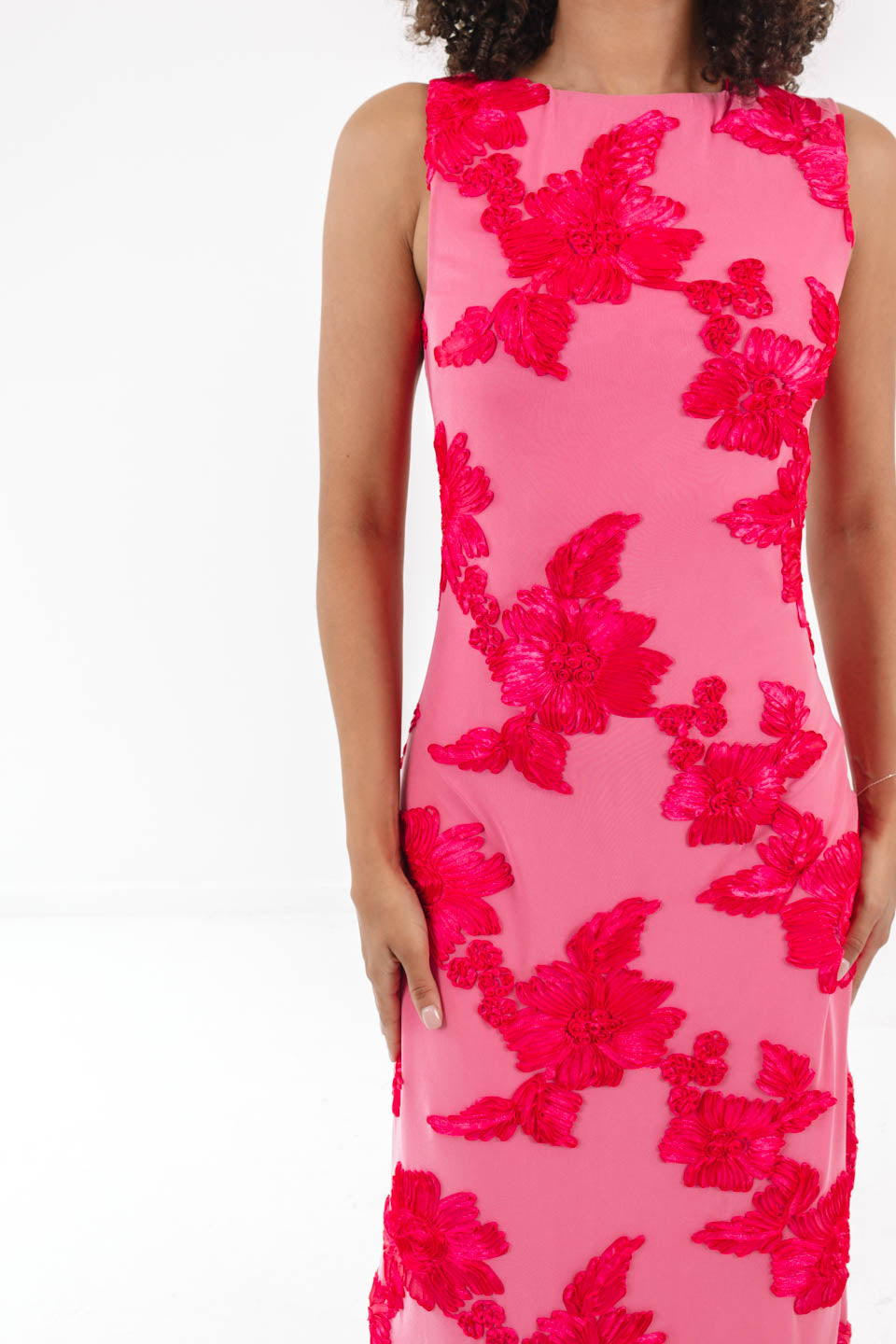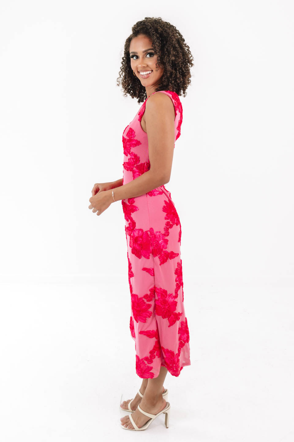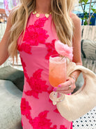 Step into the spotlight with this vibrant pink floral dress, where bold fuchsia blooms dance across a soft, sheer fabric like a garden in full celebration. Perfect for turning heads at any soirée, this dress is your ticket to radiate confidence and charm. Pair it with your favorite heels and let the compliments blossom!